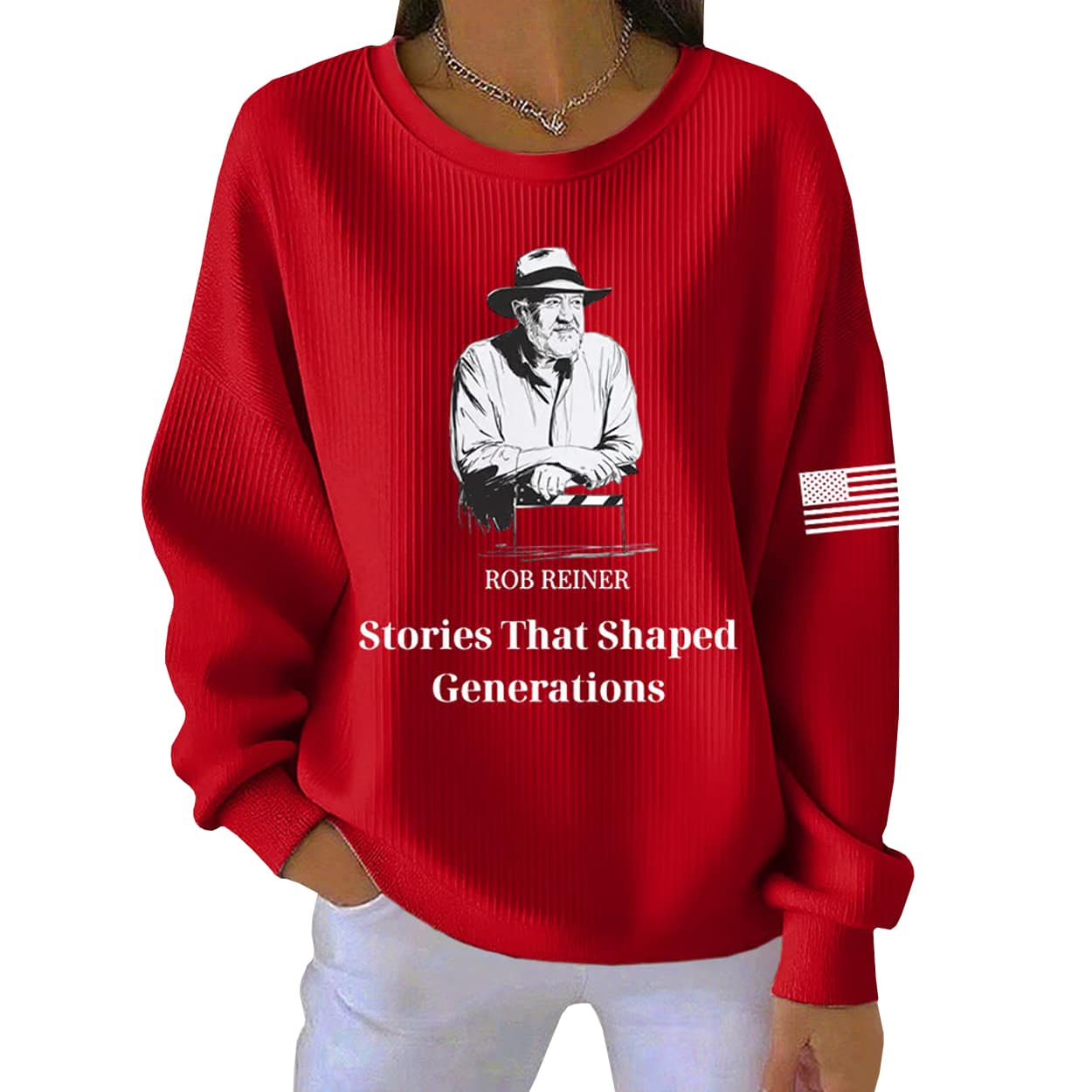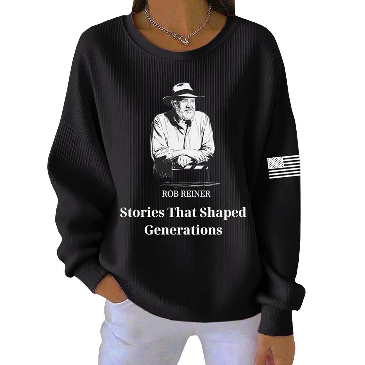 This sweatshirt is a heartfelt nod to a cinematic icon. This crisp white ribbed pullover features a striking black-and-white sketch of Rob Reiner himself—hat on, leaning thoughtfully, as if mid-scene in a story only he could tell. Just below, the words “ROB REINER Stories That Shaped Generations” are printed in bold, reminding us of the legacy he left behind. On the left sleeve, a monochrome American flag adds a subtle yet powerful touch, anchoring the design in cultural reverence.