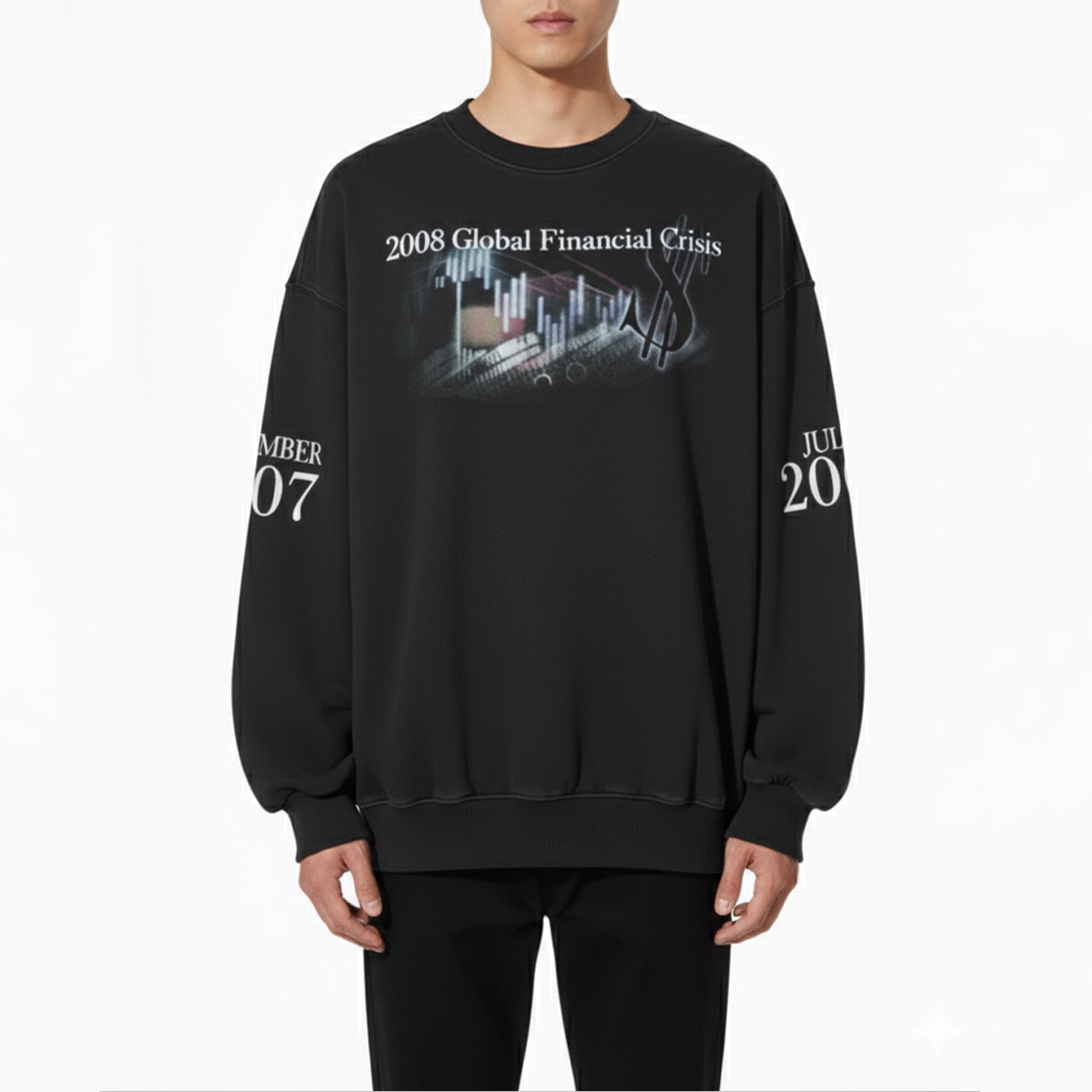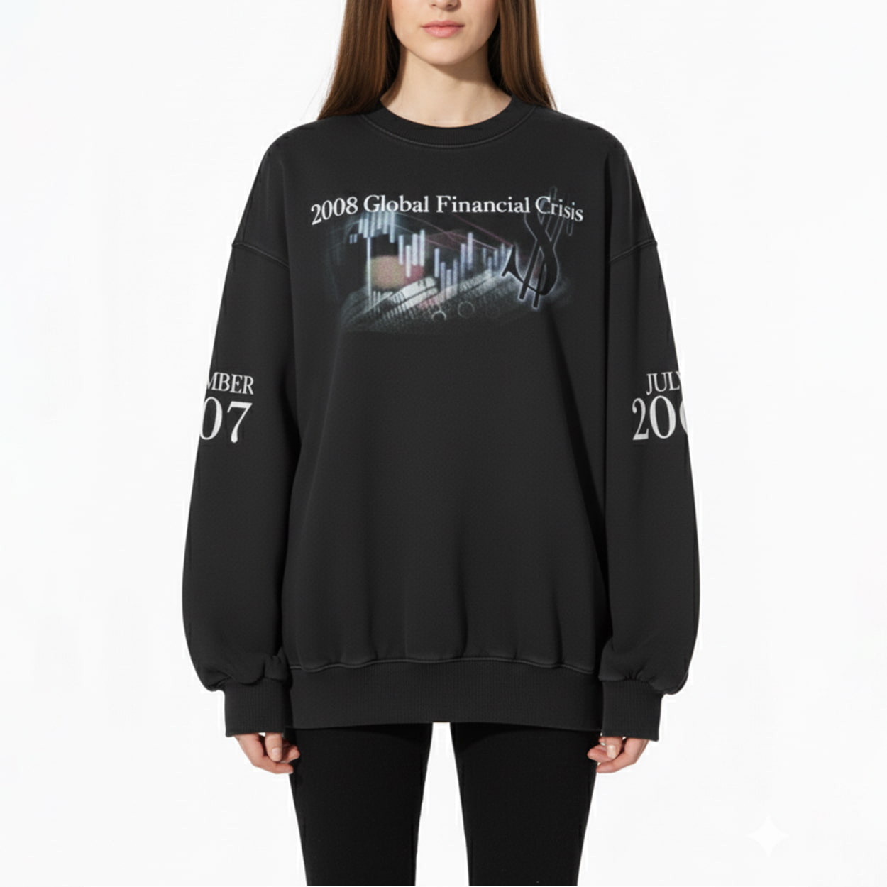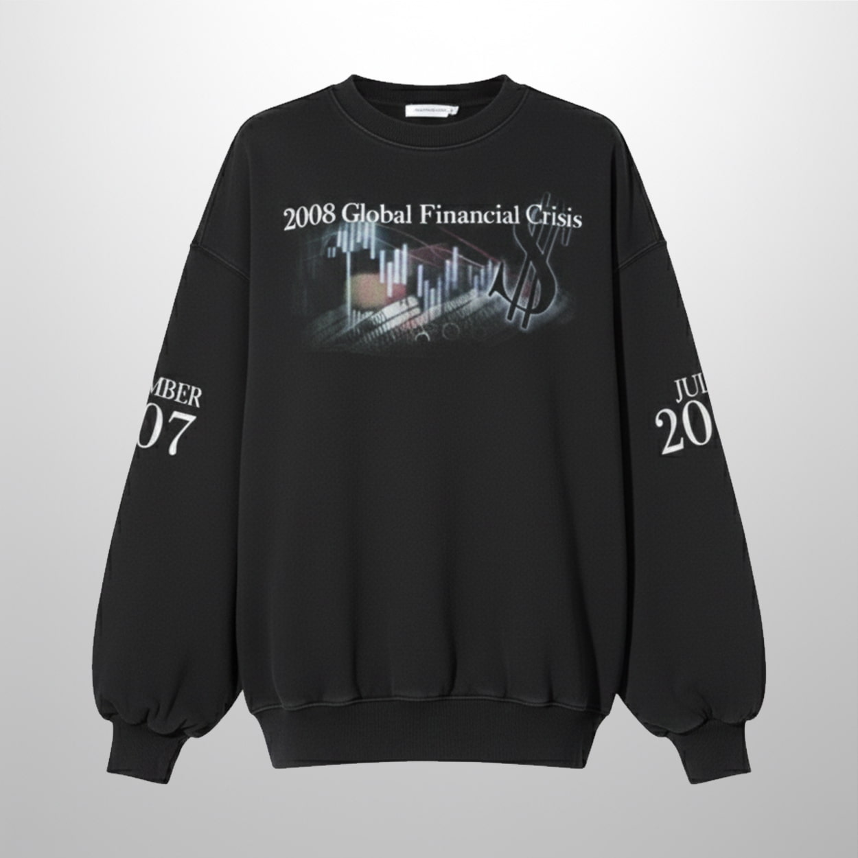 Step into the world of high-impact fashion with this sweatshirt. This eye-catching piece features a dramatic stock chart graphic in freefall, complete with candlestick patterns and a towering dollar sign—an unmistakable nod to the chaos of Wall Street. Above it all, the bold text “2008 Global Financial Crisis” sets the tone, while the sleeves mark pivotal moments with “JUNE 2009” and “SEPTEMBER 2007,” hinting at the storm before the crash.