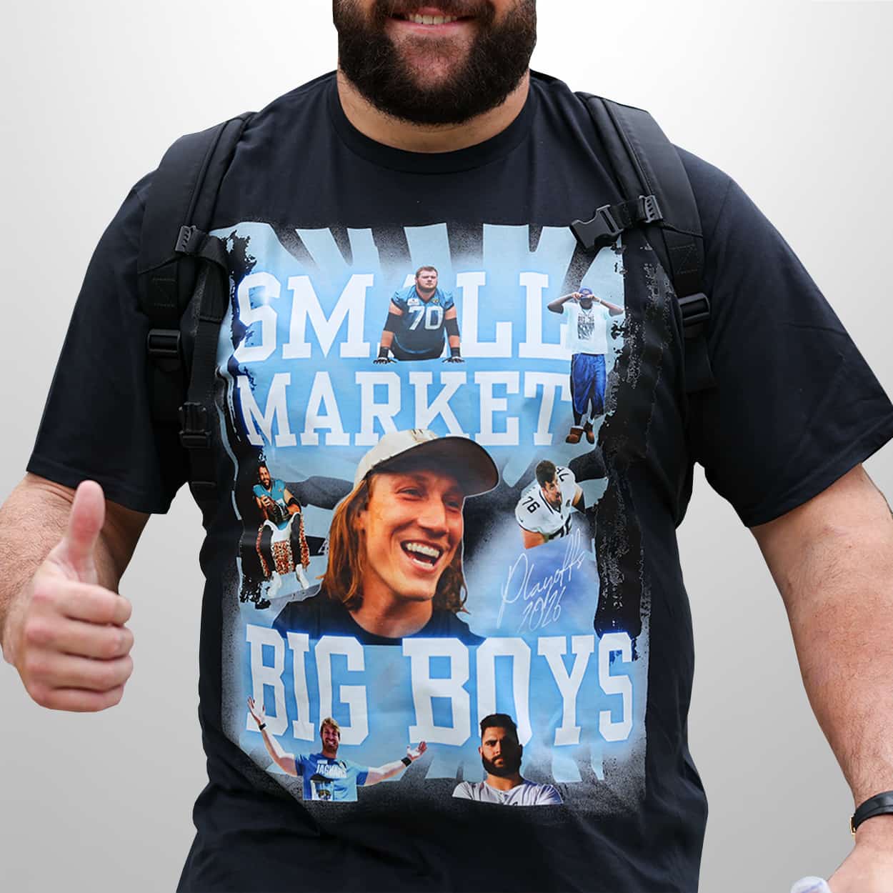 This shirt reclaims the “small market” label, transforming a perceived slight into a rallying cry for the city. It represents the blue-collar toughness of the Jaguars’ offensive line and a fan base that thrives on being underestimated. It’s a cultural salute to the “Big Boys” dominating the trenches in North Florida, proving that talent isn’t defined by market size.