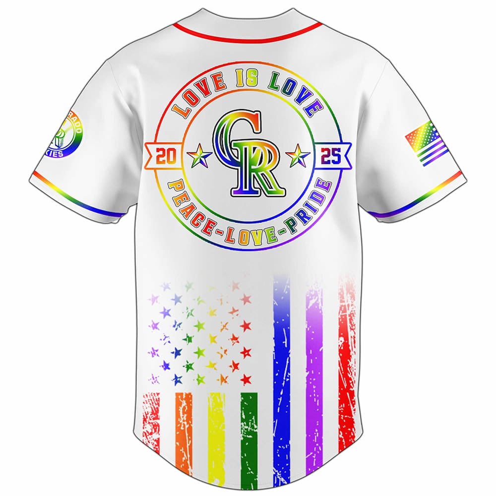 Step up to the plate in style with the Rockies Happy Pride Month Jersey 2025, a dazzling tribute to love, unity, and the Colorado Rockies spirit! This white baseball jersey bursts with personality, featuring the iconic “ROCKIES” lettering across the chest in bold orange, paired with the team’s “CR” logo nestled inside a rainbow heart. The sleeves and hem sport a distressed rainbow stripe pattern, mimicking the American flag but with a vibrant Pride twist—red, orange, yellow, green, blue, and purple hues that pop! On the back, a circular graphic declares “LOVE IS LOVE” with “PEACE LOVE PRIDE” woven into the design, alongside the Rockies’ “CR” and the year “25,” all set against a backdrop of colorful, vertical rainbow stripes. This jersey is perfect for game days or Pride celebrations.