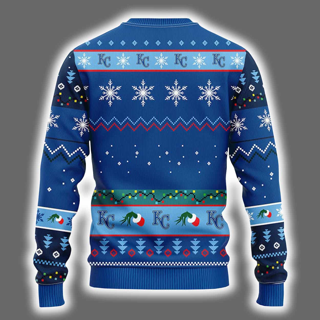 This isn’t your grandma’s Christmas sweater. This sweater is a riot of holiday cheer and baseball fandom, starring none other than the Grinch himself—clutching the Kansas City Royals “KC” logo. Set against a frosty blue backdrop sprinkled with snowflakes, zigzag borders, holly leaves, and baseball-themed accents, this sweater brings together winter whimsy and team spirit in one unforgettable look. The back keeps the chill vibes going with snowflakes and stars, making sure you’re festive from every angle.