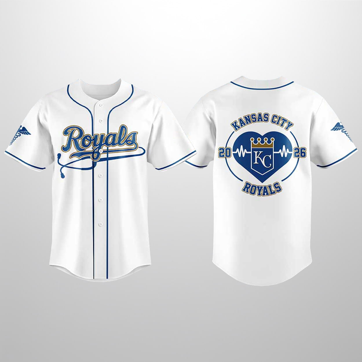 This isn’t just a jersey; it’s a grand slam for gratitude. This jersey captures the spirit of Kansas City baseball while honoring our medical MVPs. The crisp white base is accented by classic royal blue piping, but the real magic is in the clever details. On the front, the iconic “Royals” script gets a medical makeover, with the tail of the lettering cheekily morphing into a stethoscope. Flip it around, and you’ll find a pulse-pounding design featuring the “KC” crown nestled within a large blue heart, flanked by “2026” and a steady EKG line. Even the sleeve gets in on the action with a winged caduceus, proving that style can indeed be life-saving.