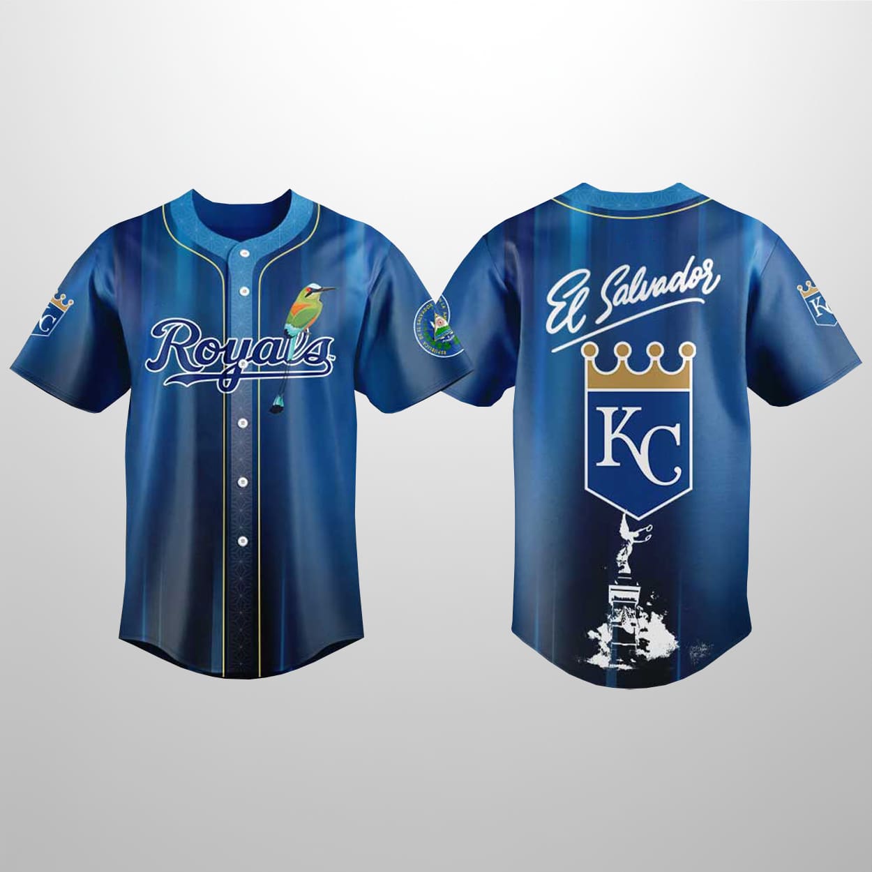 This jersey is a crown jewel for fans who carry their culture with pride. Draped in a regal deep-blue gradient, this jersey features the elegant “Royals” script across the chest, uniquely accented by a colorful Torogoz—the national bird of El Salvador. With the Salvadoran coat of arms displayed on the sleeve, this piece seamlessly merges Kansas City’s championship spirit with the enduring beauty of Salvadoran identity.