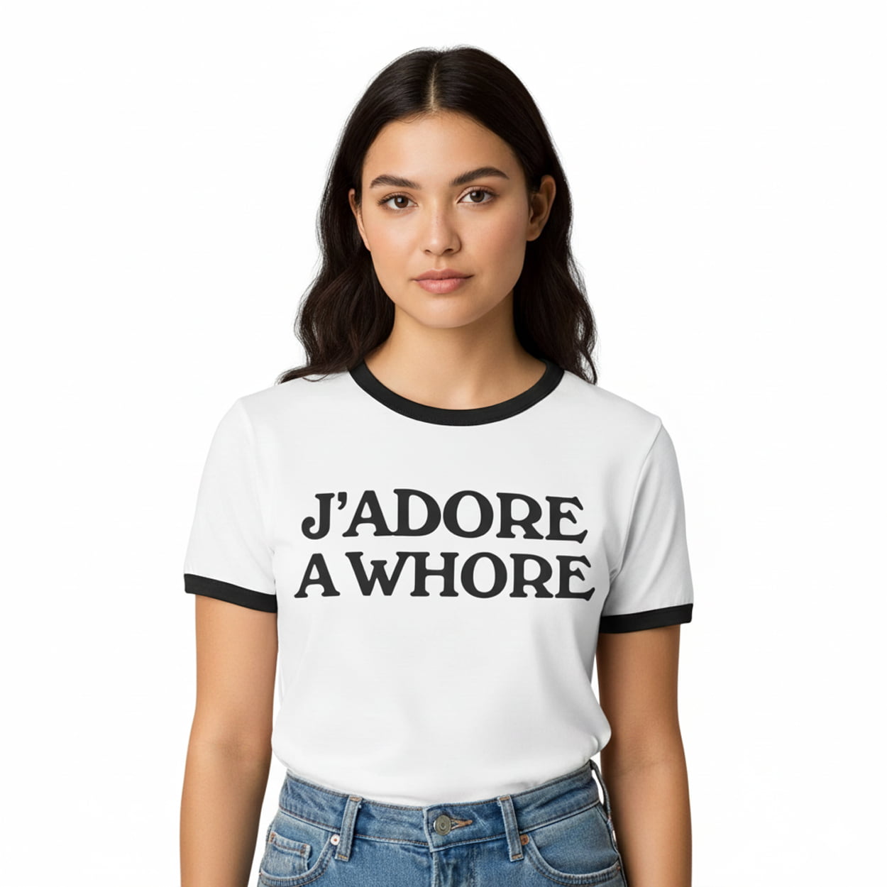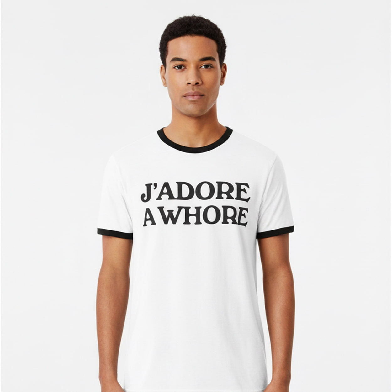 This shirt is not just clothing—it’s commentary. With its crisp white base and striking black trim around the collar and sleeves, this shirt delivers a retro silhouette with a modern twist. The centerpiece? A bold, unapologetic phrase—“J’ADORE A WHORE”—printed in thick, vintage-style serif lettering. It’s a design that’s as wearable as it is provocative, offering a playful jab at fashion’s obsession with slogans while embracing the power of irony.