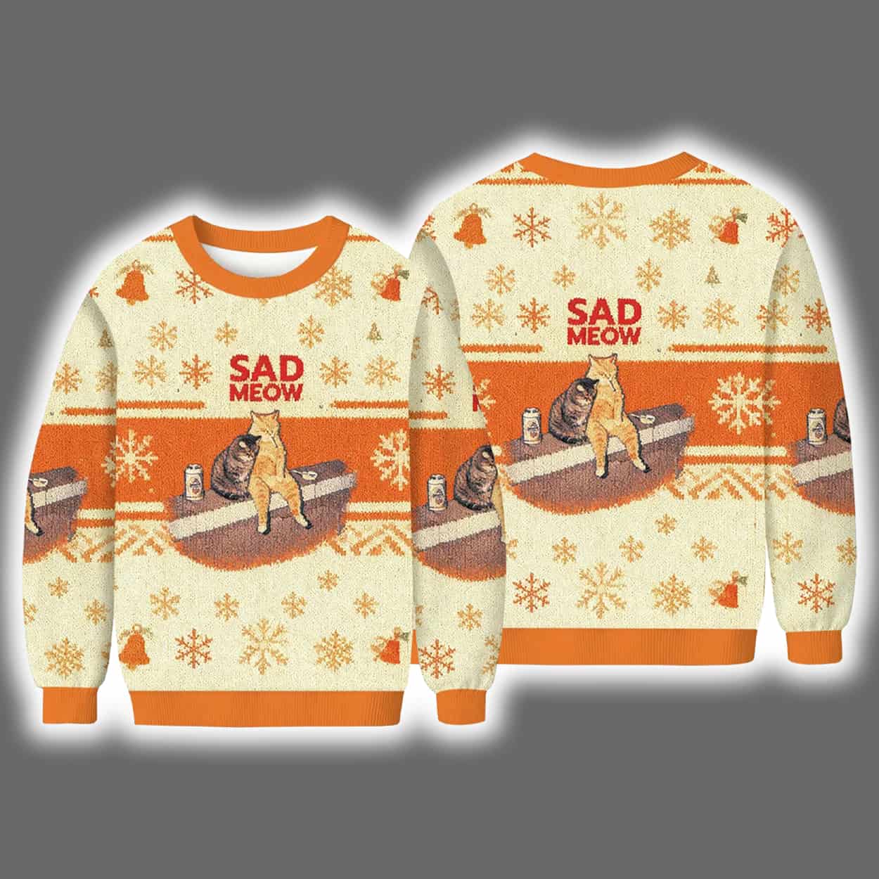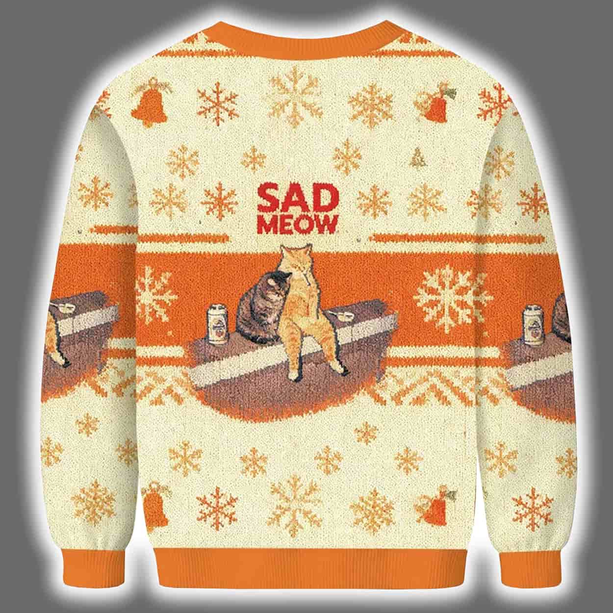 Not all holiday sweaters are jolly — some are just real. This sweater features a cream base with playful orange accents and a festive pattern of snowflakes, bells, and paw prints. But the real showstopper is the central graphic: two cats at a table. Above them, the bold red text “SAD MEOW” sets the tone. It’s a hilarious, slightly melancholic twist on traditional holiday cheer that’s perfect for those who feel more “meh” than merry.