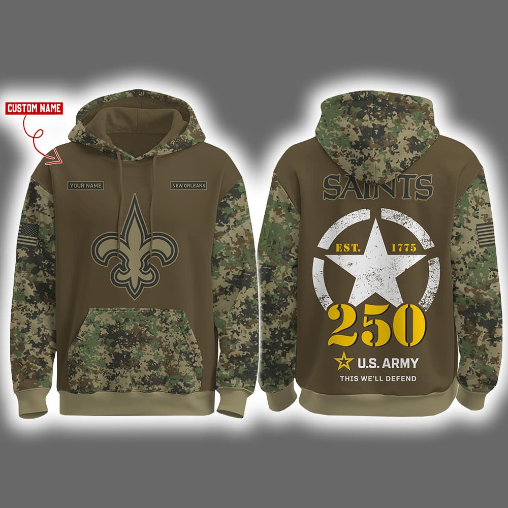Step into the spotlight with the Saints US Army 250th Birthday Celebration Night Game 2025 Hoodie Joggers Cap—a trio that includes a custom hoodie, joggers, and cap built for fans who honor legacy and love the game. The hoodie features a striking camouflage pattern on the sleeves and lower torso, contrasted by a solid olive green chest and upper back. Front and center is the iconic fleur-de-lis logo of the New Orleans Saints, flanked by two name tags—one reading “SAINTS” and the other customizable for your own name or tribute. Printed American flags on both sleeves add a patriotic punch. On the back, “SAINTS” leads the charge above a bold white star encircled with “EST. 1775,” followed by the golden number “250” and the powerful motto: “U.S. ARMY – THIS WE’LL DEFEND.” The joggers echo the camo motif with matching accents and insignia, while the cap completes the look with printed graphics that shout loyalty and legacy.