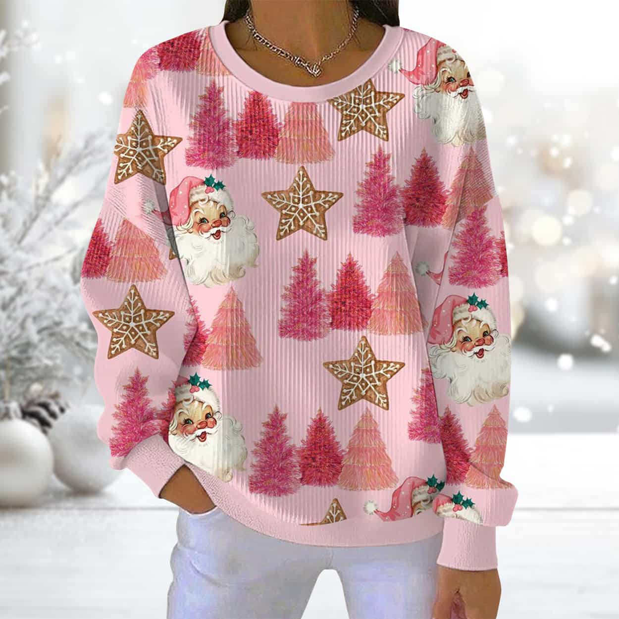 Santa Christmas Tree Ribbed Round-Neck Pink Sweatshirt