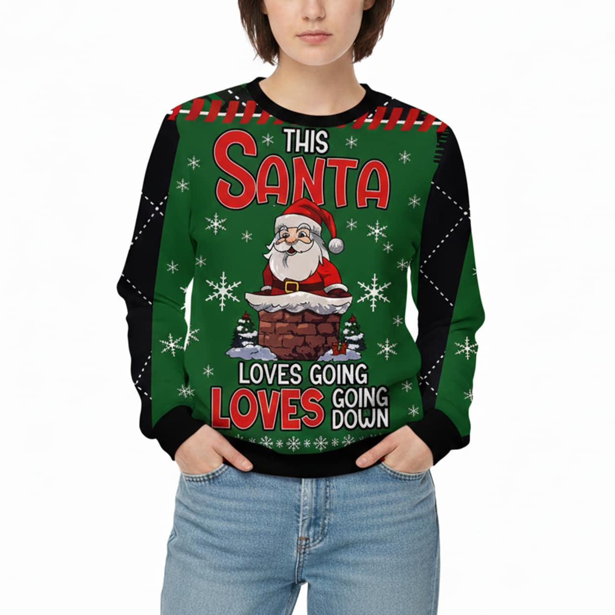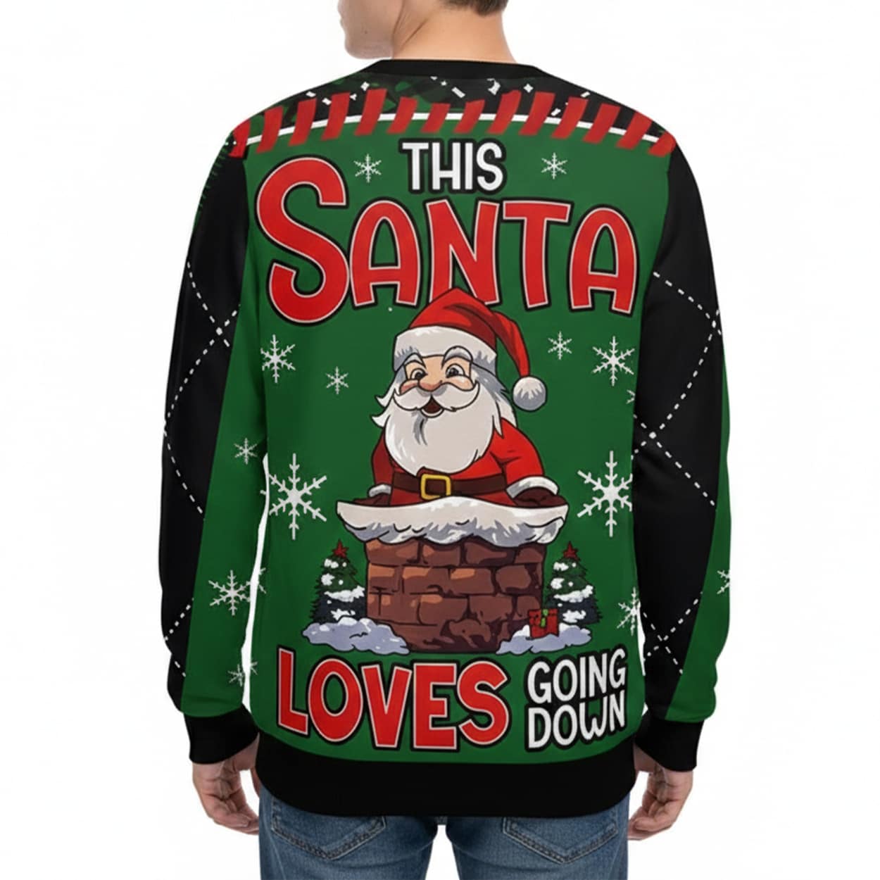 Make spirits bright—and slightly mischievous—with this sweater. This green and black festive gem features a cartoon Santa mid-slide into a chimney, surrounded by classic snowflakes and holiday motifs. But the real kicker? The bold text across the chest: “THIS SANTA LOVES GOING DOWN.” It’s a playful pun that turns a timeless tradition into a laugh-out-loud moment, perfect for those who like their holiday humor with a wink.