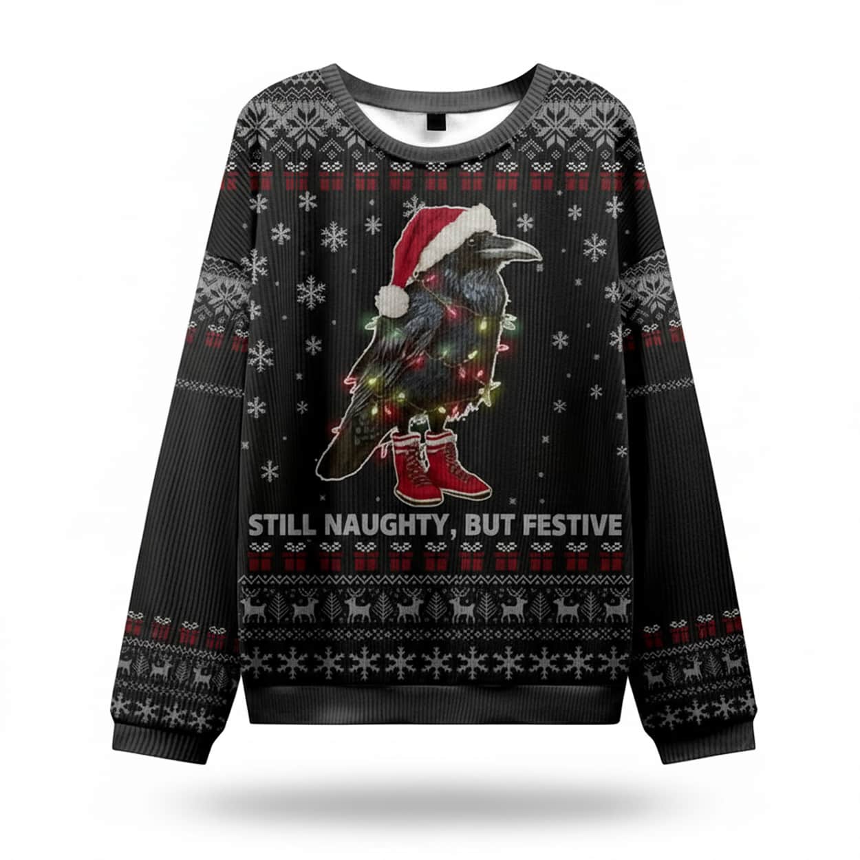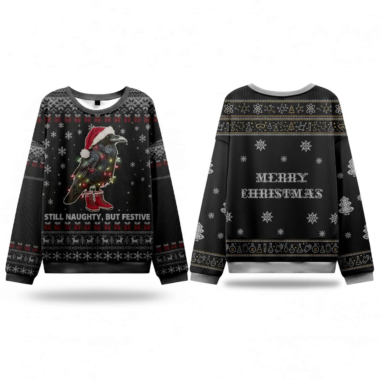 Celebrate the season with a mischievous twist in the Santa Raven Still Naughty But Festive Ugly Christmas Sweater—perfect for those who embrace holiday cheer with a side of sass.