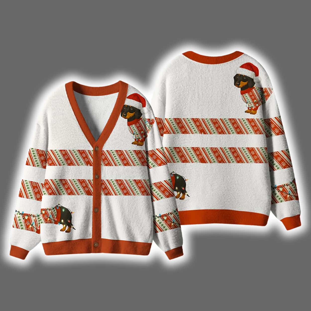 Get ready to wag some tails and warm some hearts with this cardigan. This festive sweater features a crisp white base trimmed in cheerful orange along the neckline, cuffs, and hem. Across the chest, sleeves, and back, horizontal bands of red, green, and orange geometric patterns add a playful pop of seasonal color. But the real star? A jolly pup dressed in a Santa hat and scarf, clutching a wrapped gift—adorably positioned on the front lower left and upper back. It’s a cardigan that brings together holiday spirit and canine cuteness in perfect harmony.