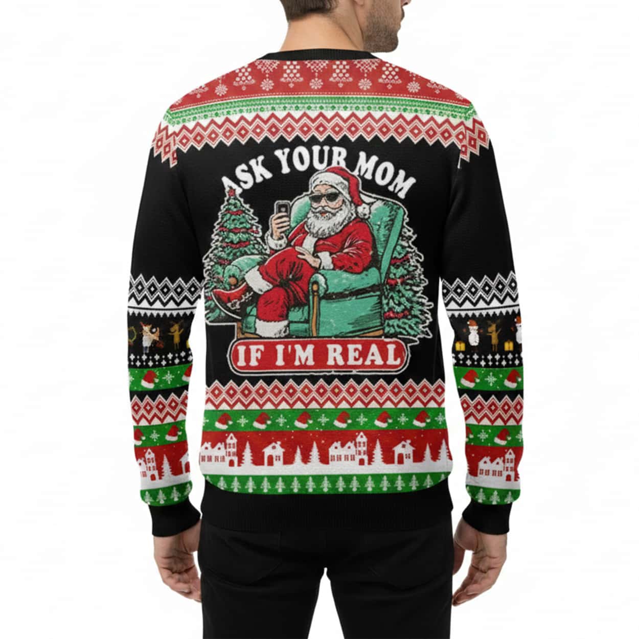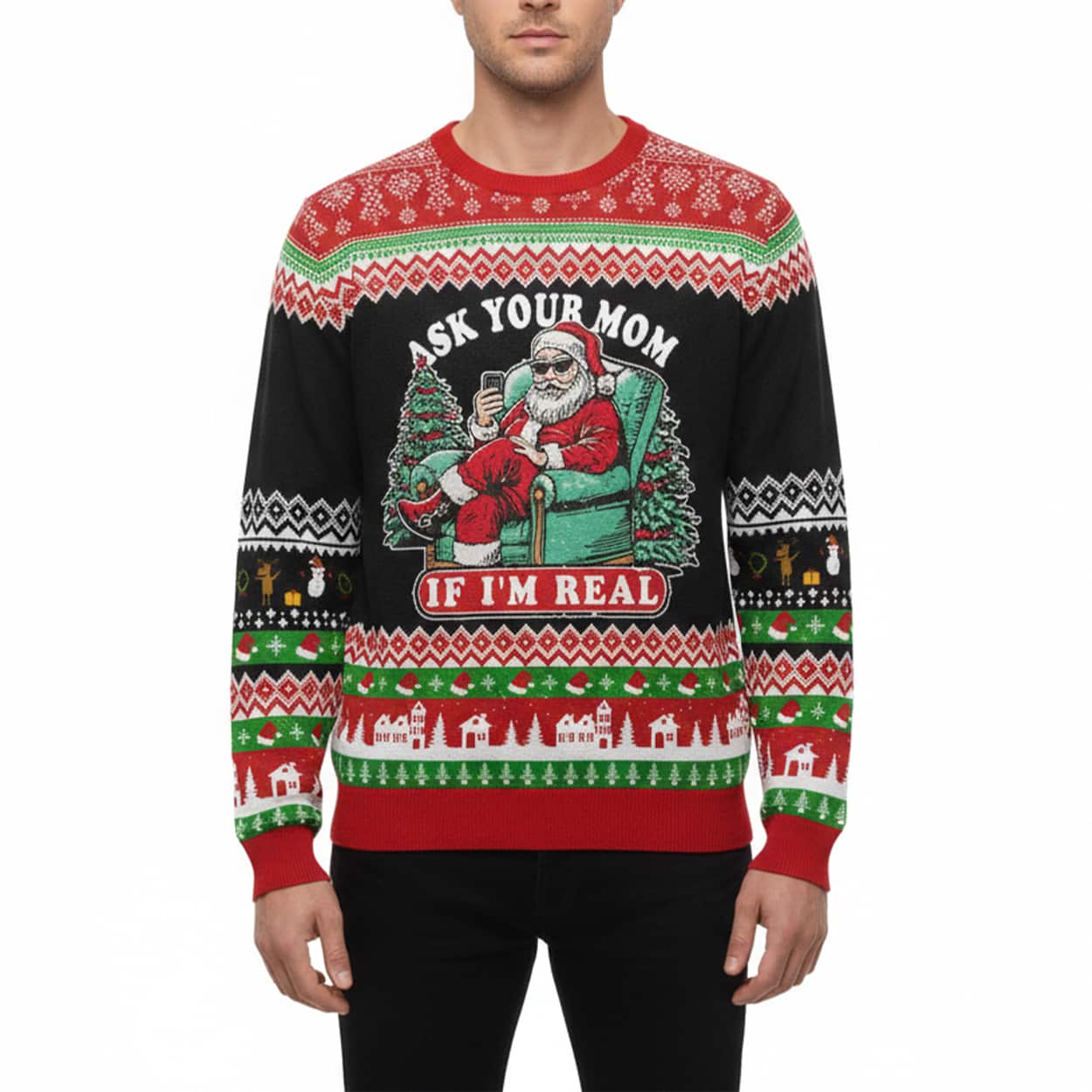 Step aside, silent nights—this sweater is here to make some noise. This sweater is a festive explosion of classic holiday motifs with a modern wink. Adorned with snowflakes, reindeer, and Christmas trees in bold reds, greens, and whites, the centerpiece features Santa Claus lounging in a green armchair, smartphone in hand, looking every bit the chill holiday icon. Above him, the sweater reads “ASK YOUR MOM,” and below, “IF I’M REAL”—a playful jab at childhood myths and adult skepticism alike.