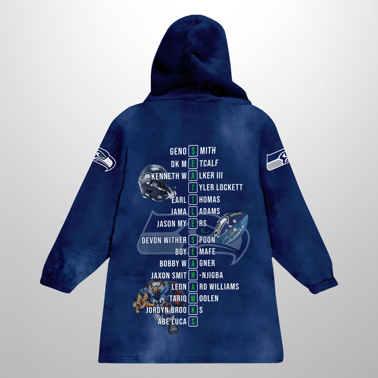 This blanket hoodie was made for fans who think big and cheer even bigger. The graphics are loud, proud, and unapologetically celebratory — a nod to the grit and grind that brought the Seahawks to the top. It’s not just about staying warm; it’s about staying legendary. Every name, every detail, every stitch is a shoutout to the team’s journey and the fans who never stopped believing.