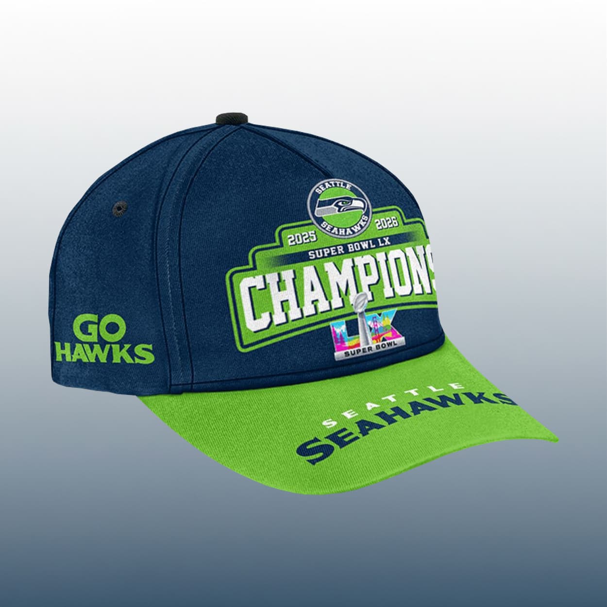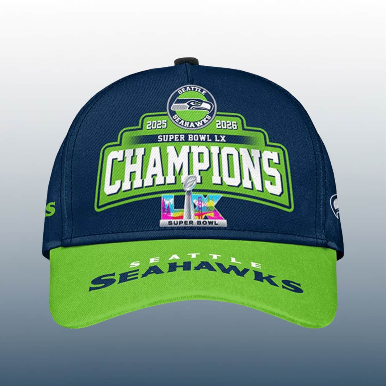 Turn heads and spark conversations with the ultimate fan statement. Drenched in navy blue with a vibrant green brim, this cap screams victory. The front proudly showcases the Seahawks logo perched above the bold proclamation: “2025 2026 SB LX CHAMPIONS.” Just below, the Vince Lombardi Trophy gleams beside a splash of colorful “SUPER BOWL” text, making it clear—this isn’t just a cap, it’s a celebration. The brim seals the deal with “SEAHAWKS” in crisp white and blue, anchoring the legacy of a team that made history.