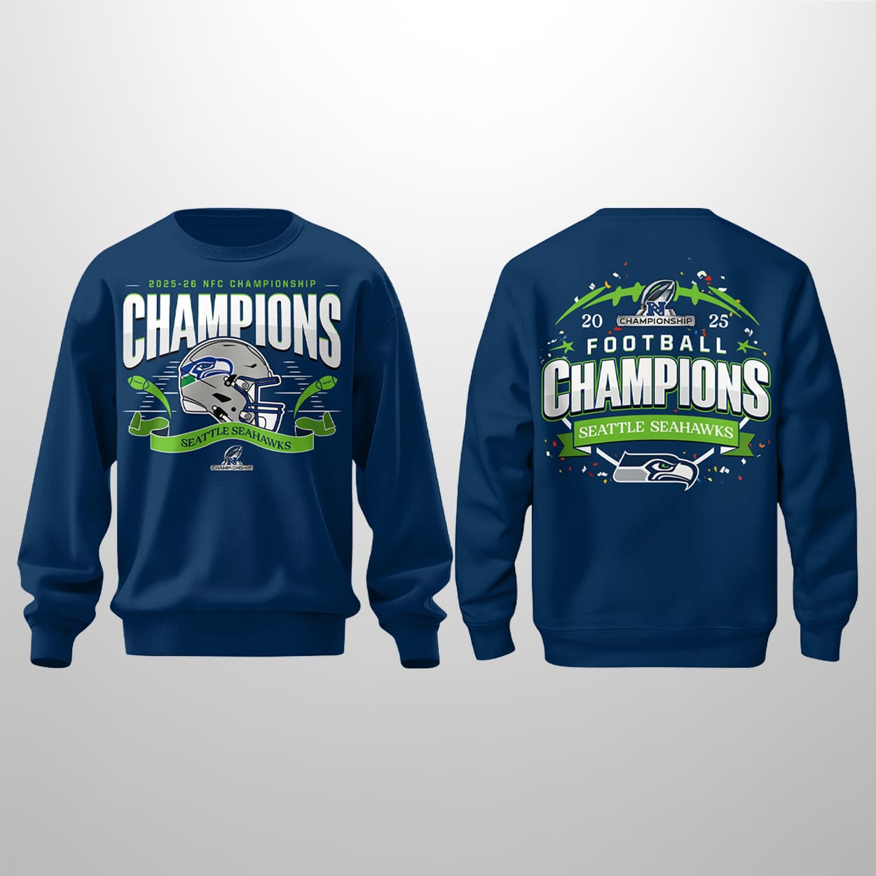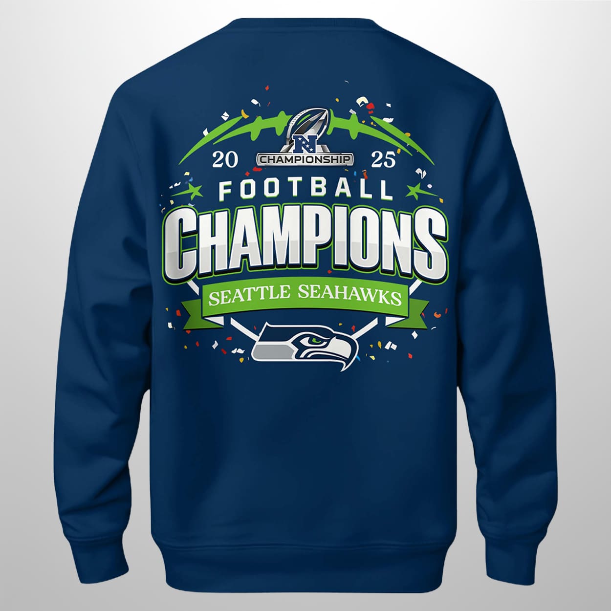 Get ready to rep the Pacific Northwest’s finest with this sweatshirt. The front bursts with energy, featuring “2025-26 NFC CHAMPIONSHIP CHAMPIONS” below a dynamic football helmet graphic and the unmistakable Seahawks logo. Green and white accents add a punch of team spirit that pops against the bold blue backdrop. Flip it around and the back goes full celebration mode: “2025 FOOTBALL CHAMPIONS SEATTLE SEAHAWKS” takes center stage, framed by a stylized football field, stars, and another proud display of the team logo. It’s a wearable victory parade for fans who live and breathe Seahawks football.