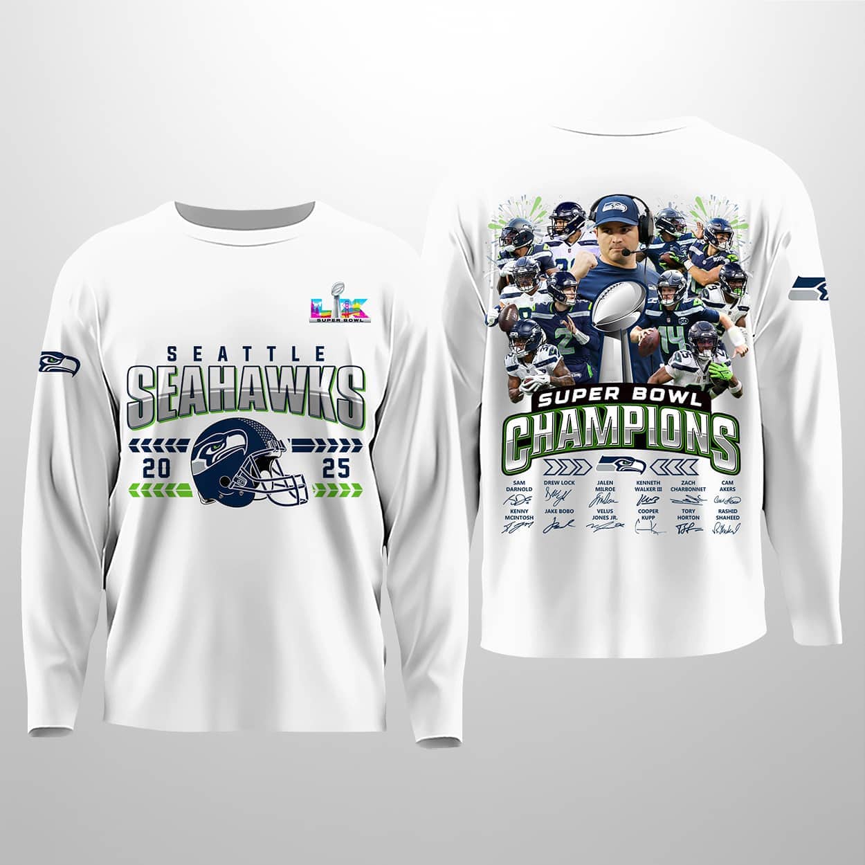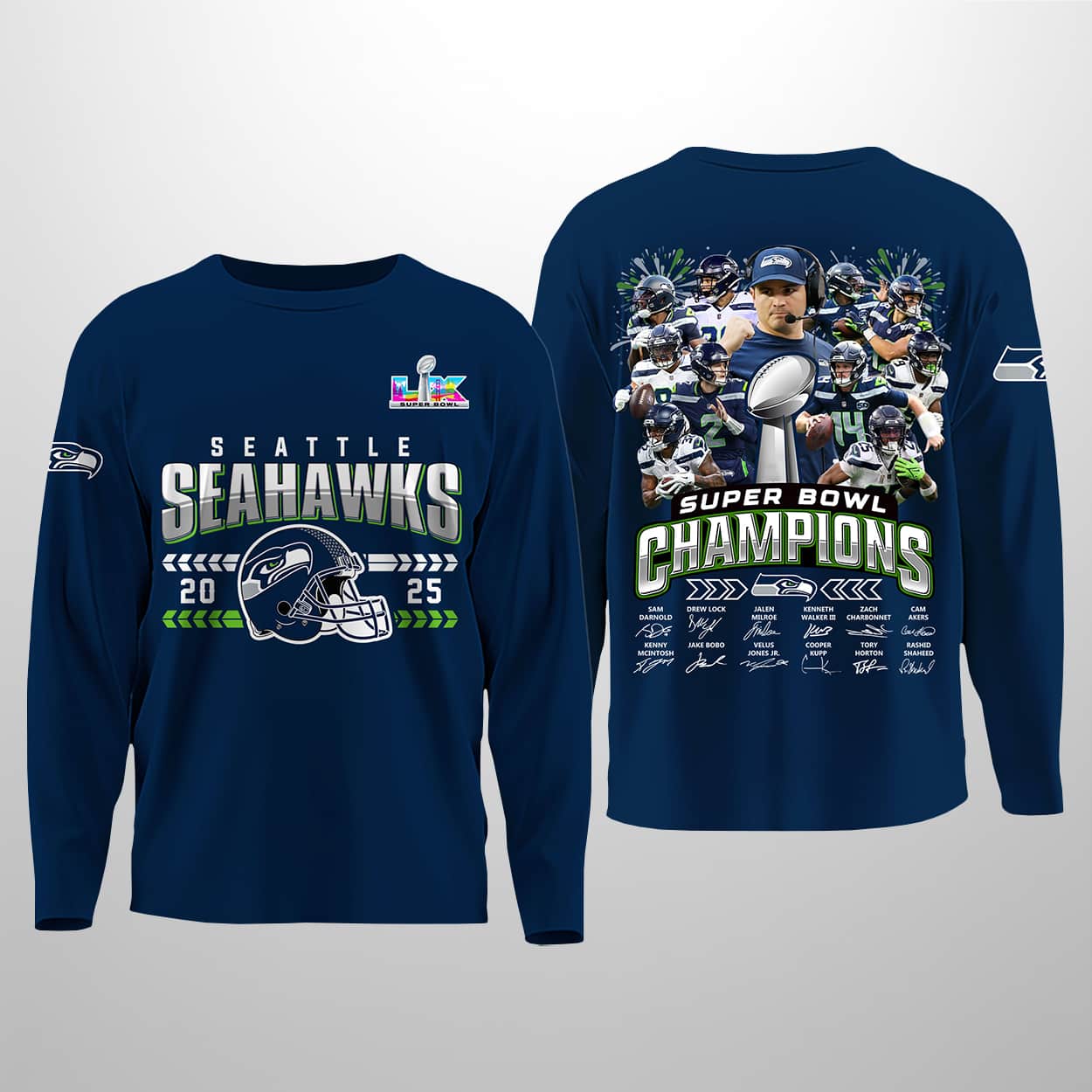 This navy long-sleeve sweatshirt is a fan’s dream come true, designed to showcase the Seahawks’ 2025 championship glory. On the front, “SEAHAWKS 2025” is emblazoned across the chest, paired with a striking Seahawks helmet graphic and the SB logo in the corner—making it clear this is no ordinary season. The back is where the celebration truly comes alive: “SB CHAMPIONS” crowns a dynamic illustration of a football player hoisting the Vince Lombardi Trophy, surrounded by teammates in a moment of pure victory. Beneath the artwork, a list of names or signatures immortalizes the champions who made history.