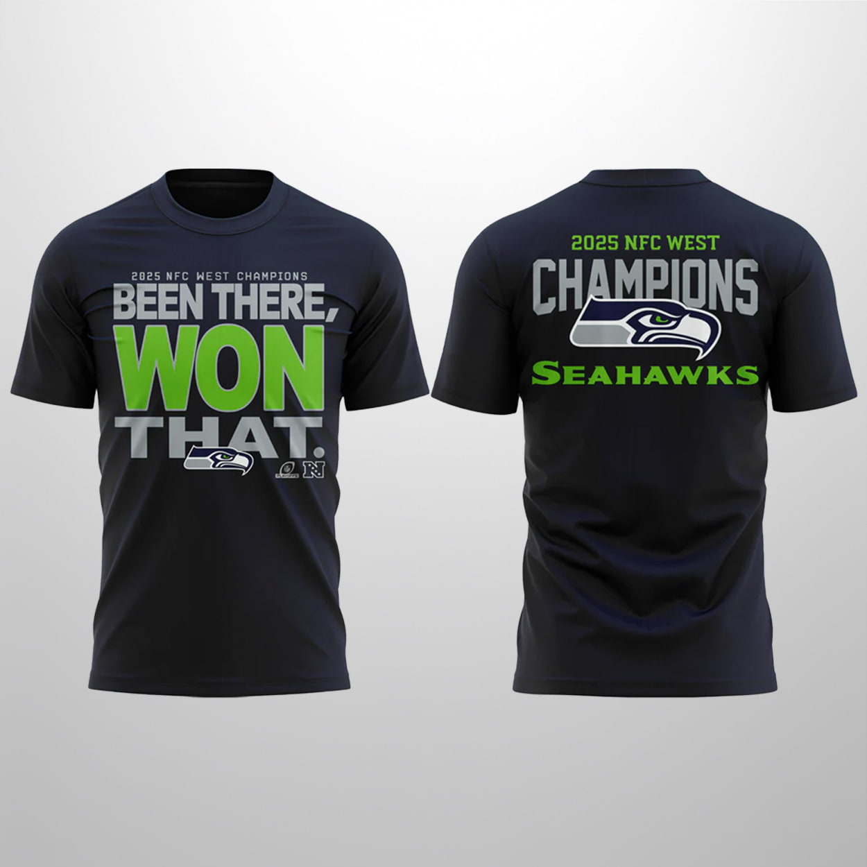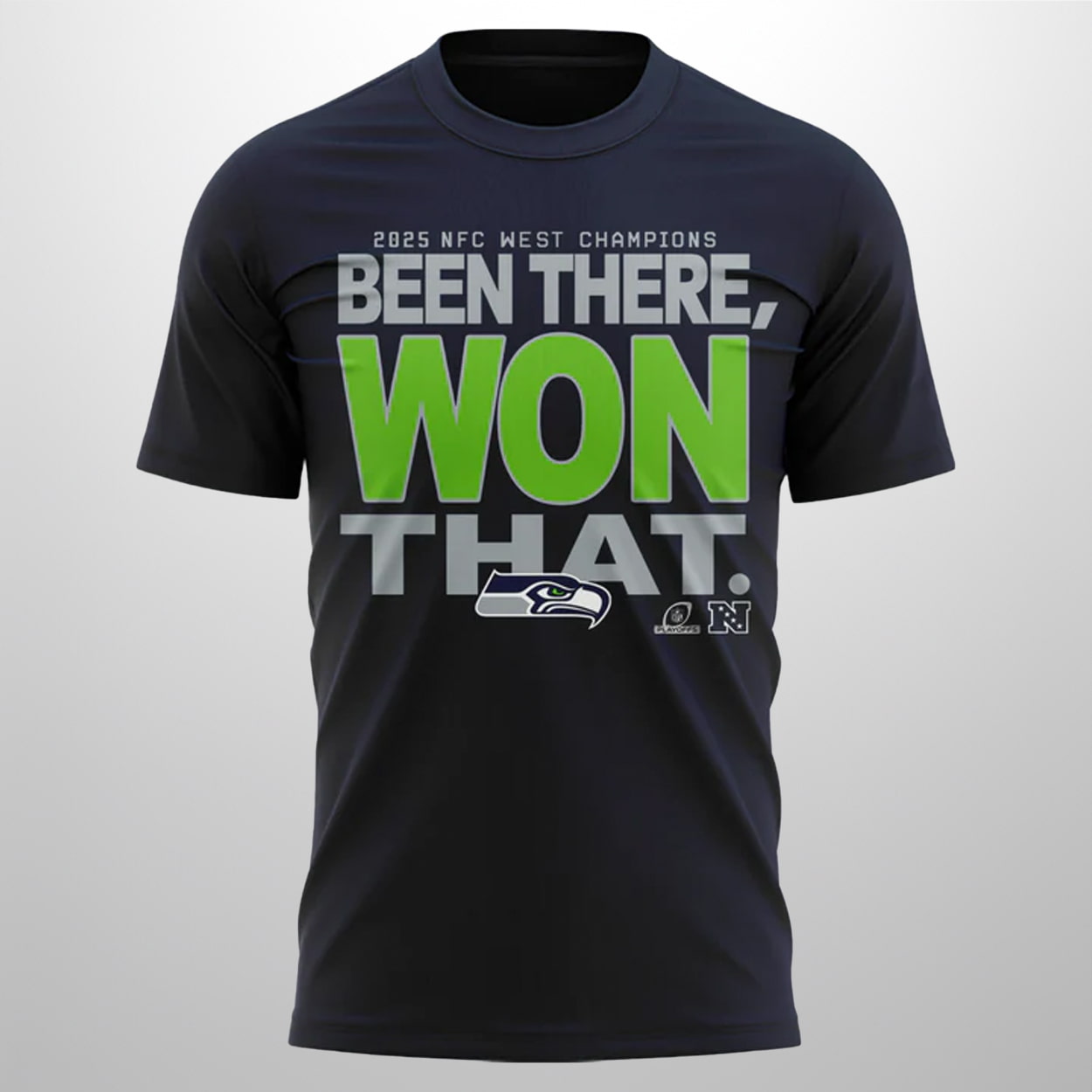 This shirt is a swagger-packed tribute to a season of triumph. On the front, the phrase “2025 NFC WEST CHAMPIONS BEEN THERE, WON THAT.” is emblazoned in bold white text, punctuated by the iconic Seahawks logo—because subtlety isn’t the point. Flip it around and you’ll find “2025 NFC WEST CHAMPIONS SEAHAWKS” stamped across the back, with the logo proudly centered between the words. It’s a full-circle celebration of dominance, designed for fans who live loud and cheer louder.