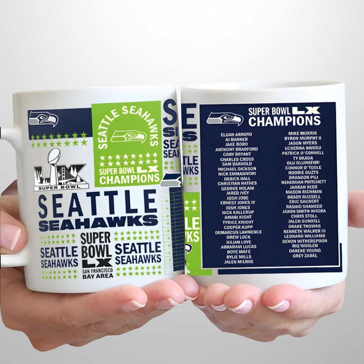 Celebrate the Seahawks’ historic SB LX victory with this Seahawks 2026 SB LX Champions Ceramic Mug, featuring the full championship roster and iconic game details from their 29-13 win over the Patriots.