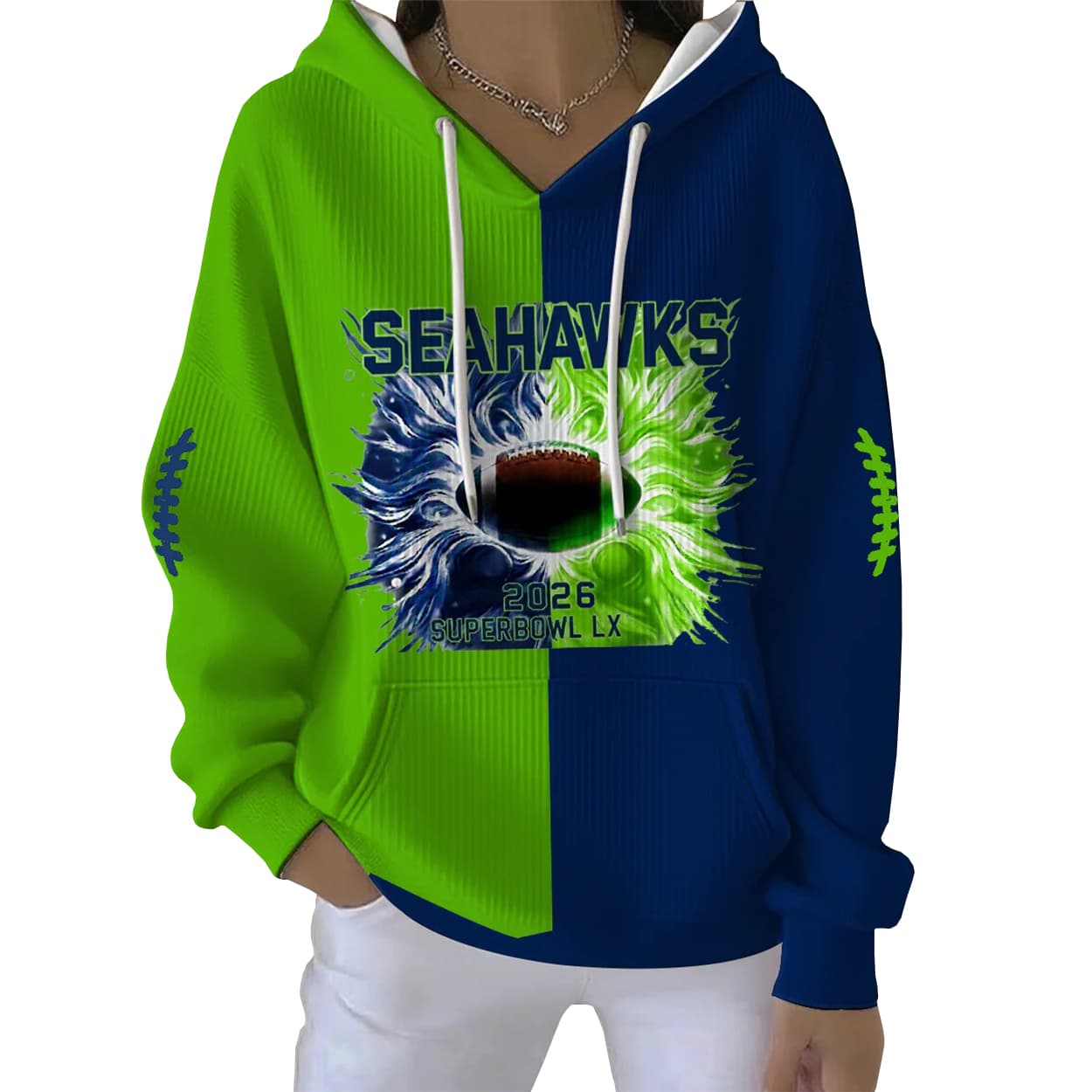This hoodie is a visual touchdown for fans who live loud and cheer louder. With a striking split of neon green on the left and navy blue on the right, this hoodie doesn’t just stand out—it shouts Seahawks pride. Front and center, “SEAHAWKS” blazes across the chest in bold lettering above a football engulfed in a wild burst of blue and green flames. Below, “2026 SB LX” locks in the legacy. The sleeves add extra flair with football lace graphics that run down each arm, making this hoodie a full-body celebration of Seattle’s championship swagger.