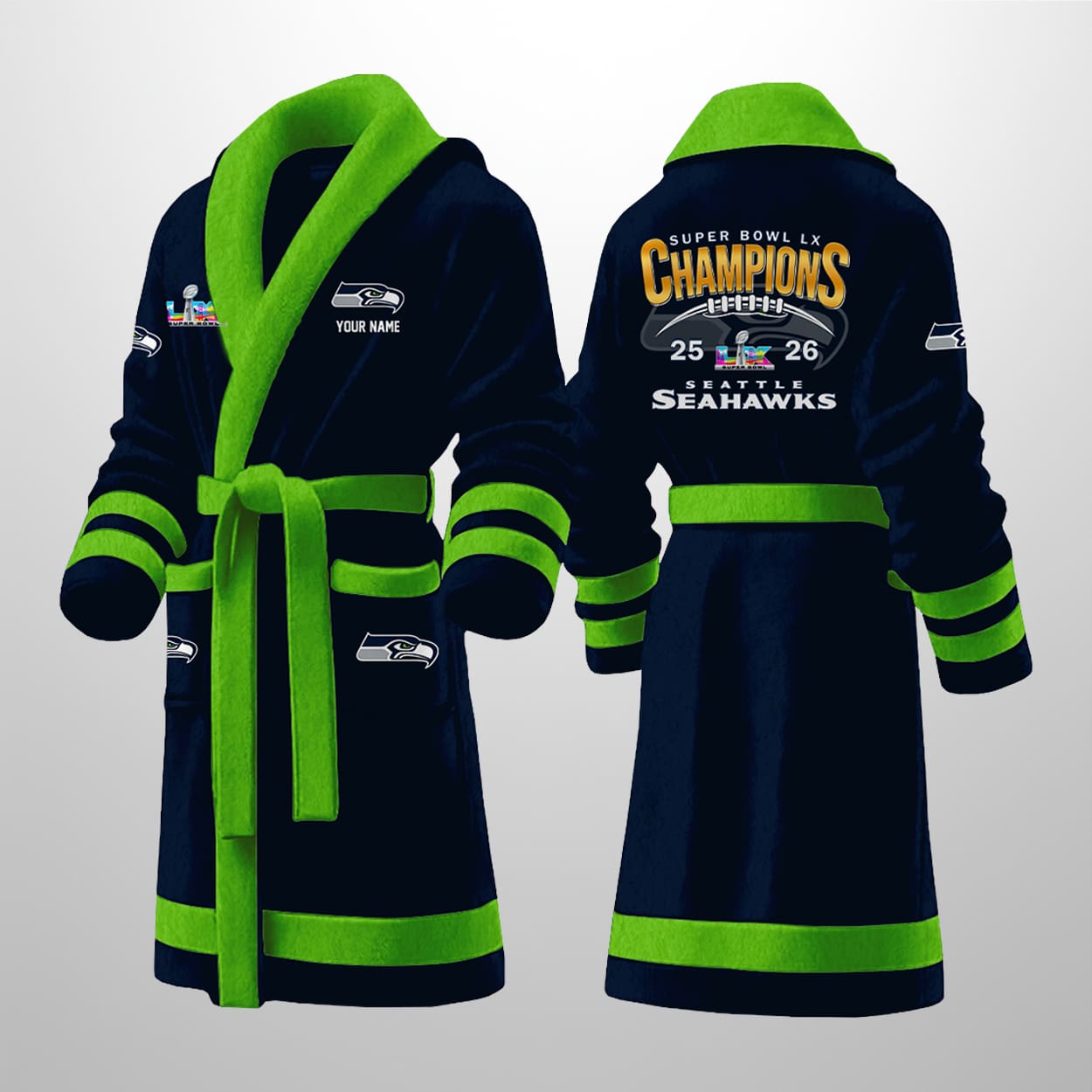 Step into victory with this bathrobe, a fan’s dream come true. Designed in striking navy blue with vibrant green accents, this robe captures the energy of Seattle’s championship spirit. The front proudly displays the Seahawks logo alongside a customizable name area, making it uniquely yours. On the back, bold lettering proclaims “SUPER BOWL LX CHAMPIONS 25 26 SEAHAWKS,” ensuring that every glance reminds you of the team’s historic triumph over the Patriots.