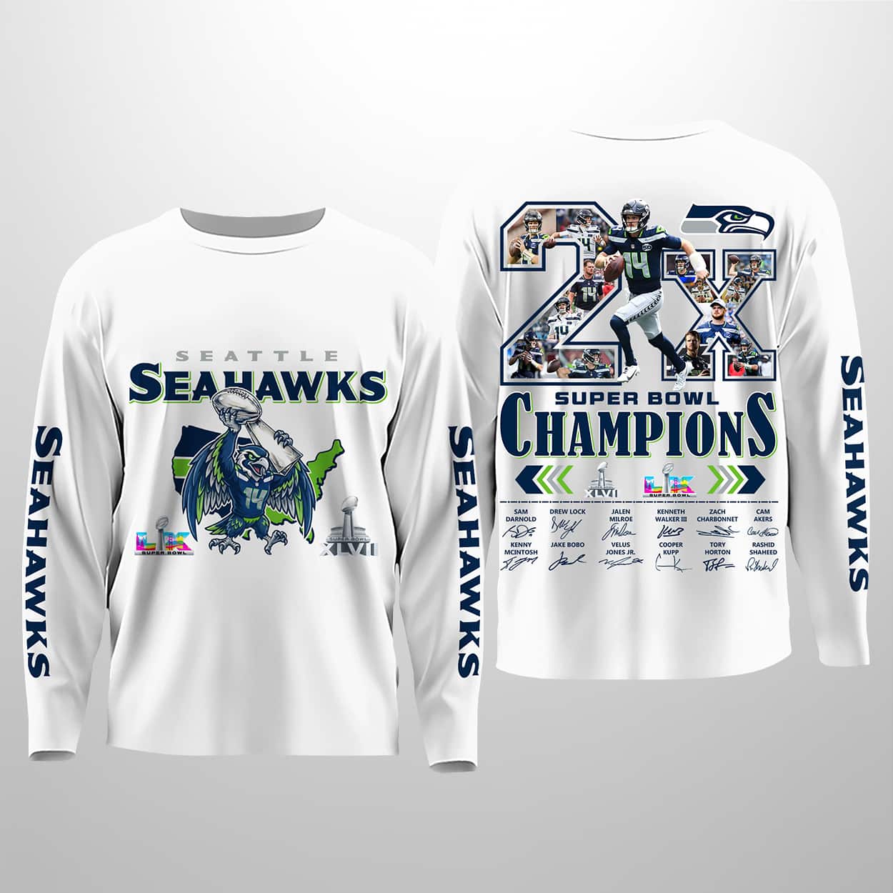 Celebrate the Seahawks’ thrilling second SB victory over the Patriots in SB LX with the Seahawks 2X SBowl Champions 2026 Sweatshirt. A bold commemorative piece that turns triumph into wearable pride.