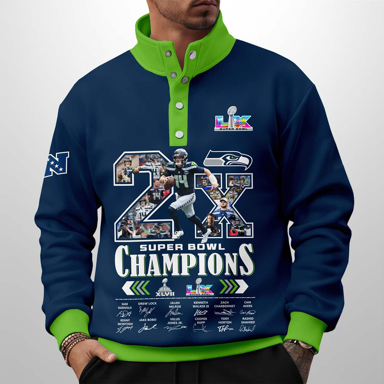 This sweater is a victory parade printed into every detail. The front proudly declares “2X SB CHAMPIONS,” with the massive “2X” filled with dynamic images of Seahawks players and the iconic team logo. Beneath the text, the SB XLVIII and SB LX logos stand as milestones of glory, complete with the years and scores that mark the team’s unforgettable triumphs. Bright green accents on the collar and cuffs add a burst of energy, while Western-style buckles transform this commemorative piece into a bold fashion statement.