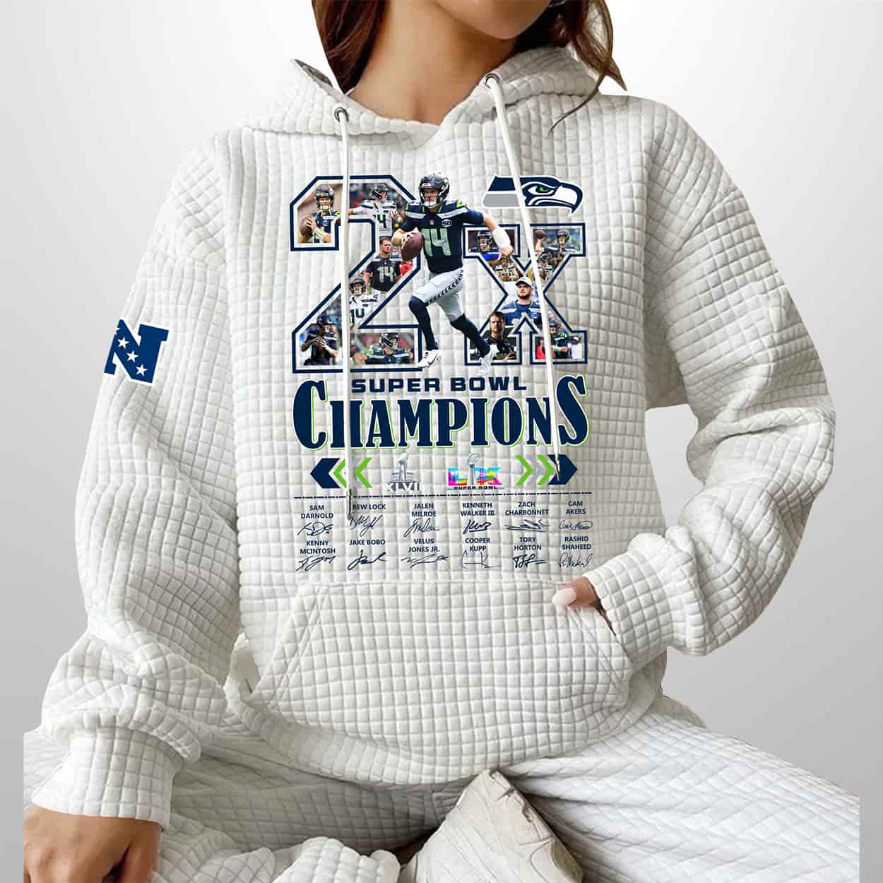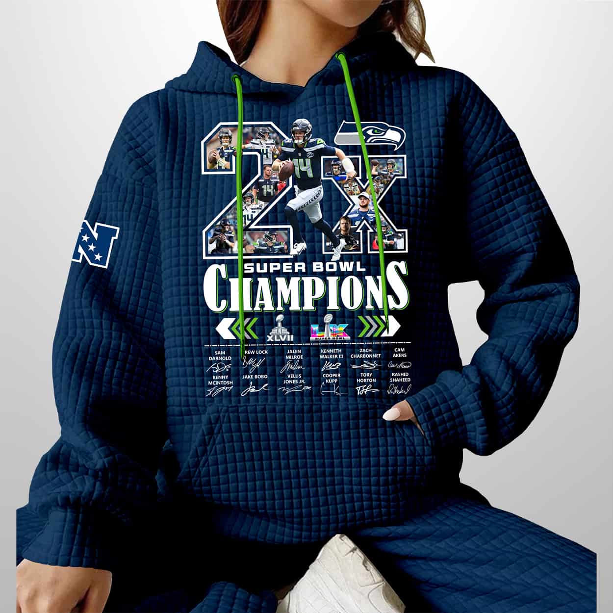 This hoodie is a championship celebration you can pull over your head. The front proudly declares “2X SB CHAMPIONS” filled by dynamic images of Seahawks players in action, creating a collage of grit and glory. Beneath the bold headline, small logos and text detail the years of Seattle’s victories, immortalizing the unforgettable SB XLVIII win and the thrilling SB LX triumph over the Patriots. On the sleeve, an “NFC” patch adds a touch of conference pride, while bright green drawstrings on the hood bring a pop of energy to the deep navy design.