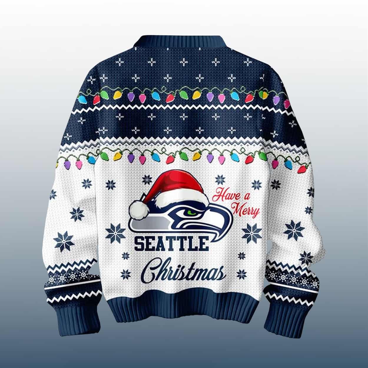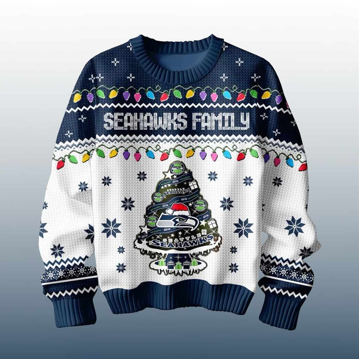 Get ready to light up the holidays with this sweater. This festive masterpiece features a bold blue canvas sprinkled with snowflakes and wrapped in colorful Christmas lights across the chest, shoulders, and hem. The front proudly displays “SEAHAWKS FAMILY” in crisp white lettering above a decorated Christmas tree, complete with ornaments and a glowing Seahawks logo at its heart. Turn it around and the back keeps the cheer going with a Santa-hat-wearing Seahawks emblem and the playful message: “Have a Merry SEATTLE Christmas” in a mix of red cursive and bold white block letters.