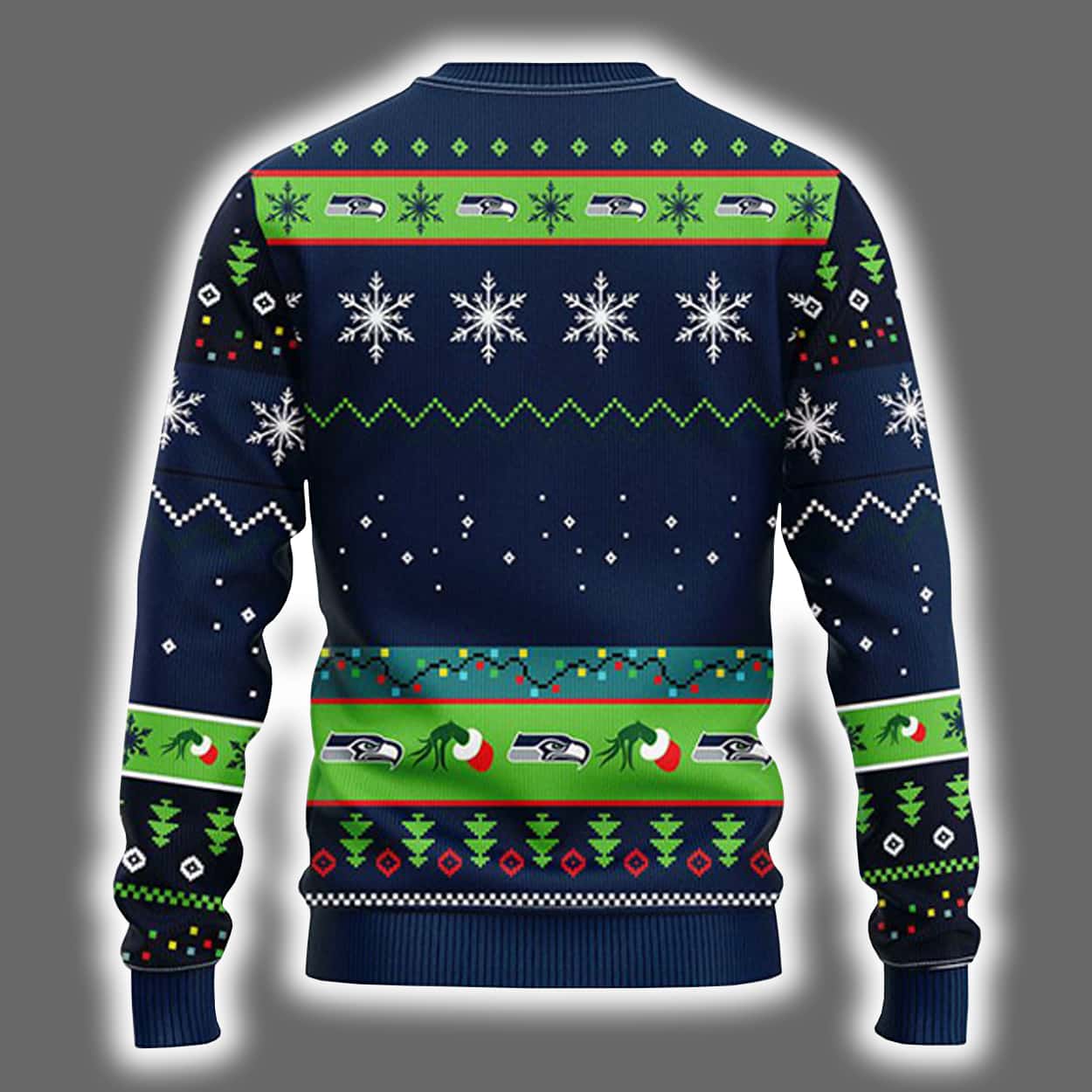 This isn’t your grandma’s Christmas sweater—it’s a full-blown holiday heist! Front and center, the Grinch is caught red-handed snatching a sack of presents, hovering mischievously above the proud Seahawks logo. Snowflakes swirl across a starry night backdrop, while rows of festive patterns—Christmas trees, football helmets, and seasonal motifs—wrap around the sweater in a riot of green, red, blue, and white. The back keeps the party going with matching patterns, minus the Grinch, letting the front do all the talking. Whether you’re tailgating in December or cozying up by the fire, this sweater is a guaranteed conversation starter.