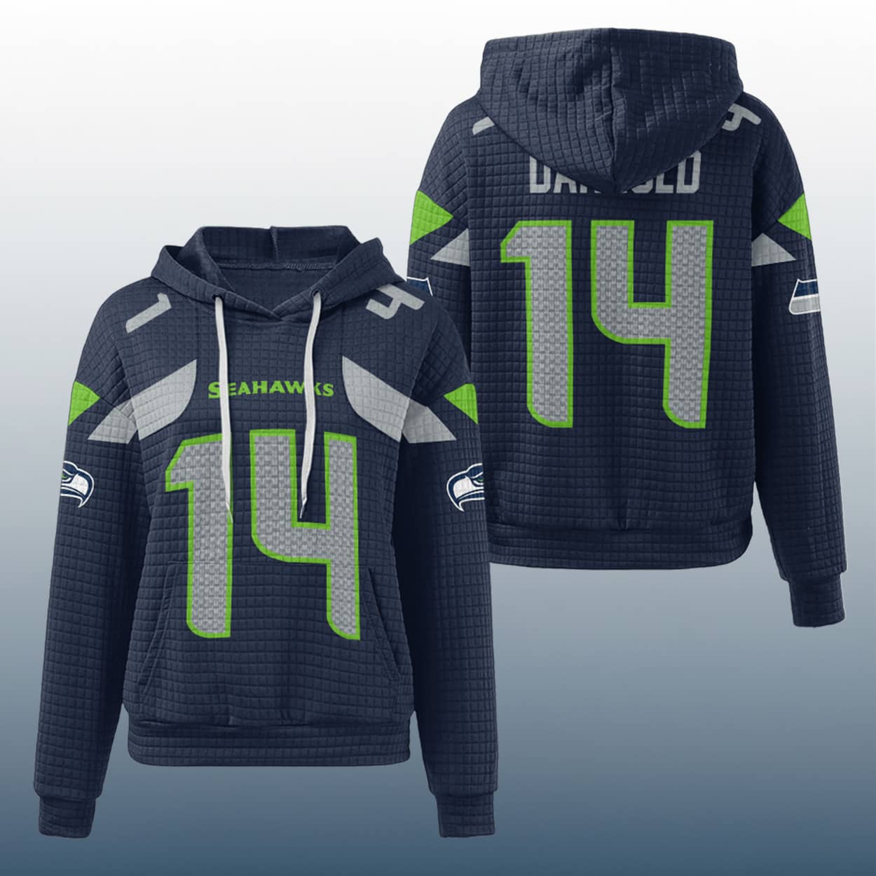 Turn heads and charge forward with the Seahawks Sam Darnold 14 Waffle Hoodie—a bold fusion of team pride and fearless fashion. Featuring standout graphics and electrifying details, it’s built for fans who lead with confidence.