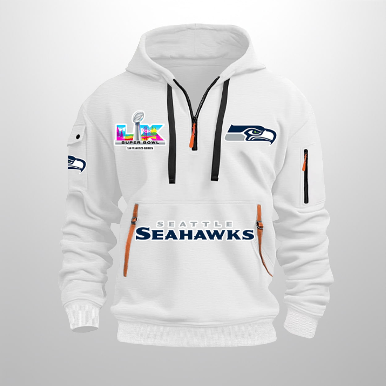 This hoodie is a head-turning tribute to Seattle’s gridiron greatness. With a crisp white base, this hoodie pops with layered logos and dynamic typography. “SEAHAWKS” stretches boldly across the chest, flanked by the iconic team logo on the right. Orange-accented zipper pockets—front and sleeve—add utility and contrast, while black drawstrings bring balance to the look. It’s not just a hoodie—it’s a wearable celebration.