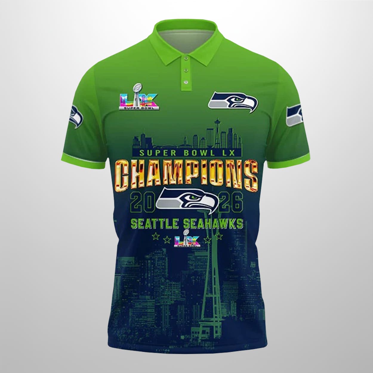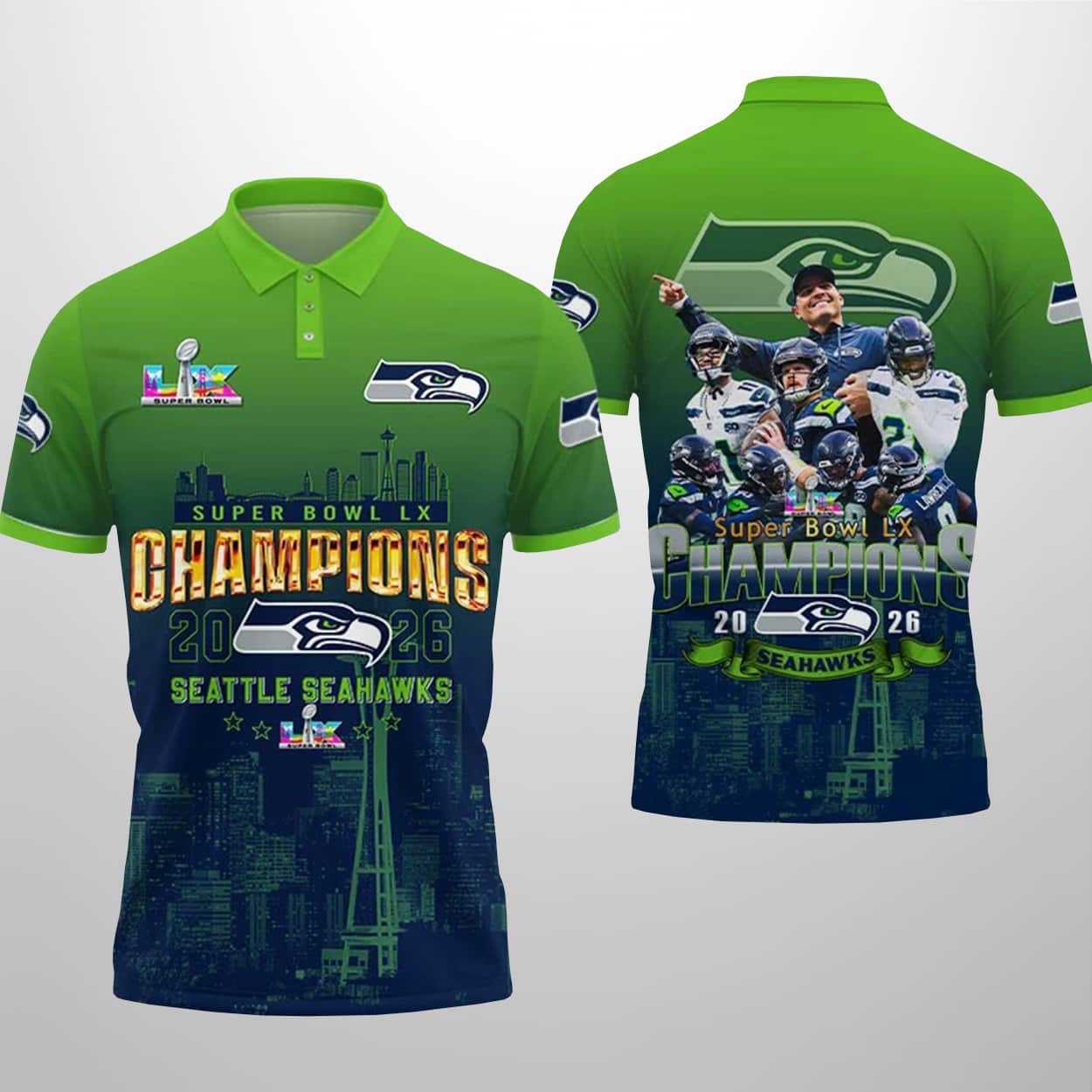This commemorative polo shirt is a dazzling tribute to the Seahawks’ SB LX championship. The front proudly declares “SB LX CHAMPIONS 2026 SEAHAWKS” alongside the team’s iconic logo, the SB LX emblem, and a patriotic American flag detail on the sleeve. A stylized Seattle cityscape, complete with the Space Needle, anchors the design, blending team pride with hometown spirit. On the back, a collage of Seahawks players in dynamic action poses captures the energy of their dominant 29–13 win, while the bold championship text ensures no one forgets the moment.