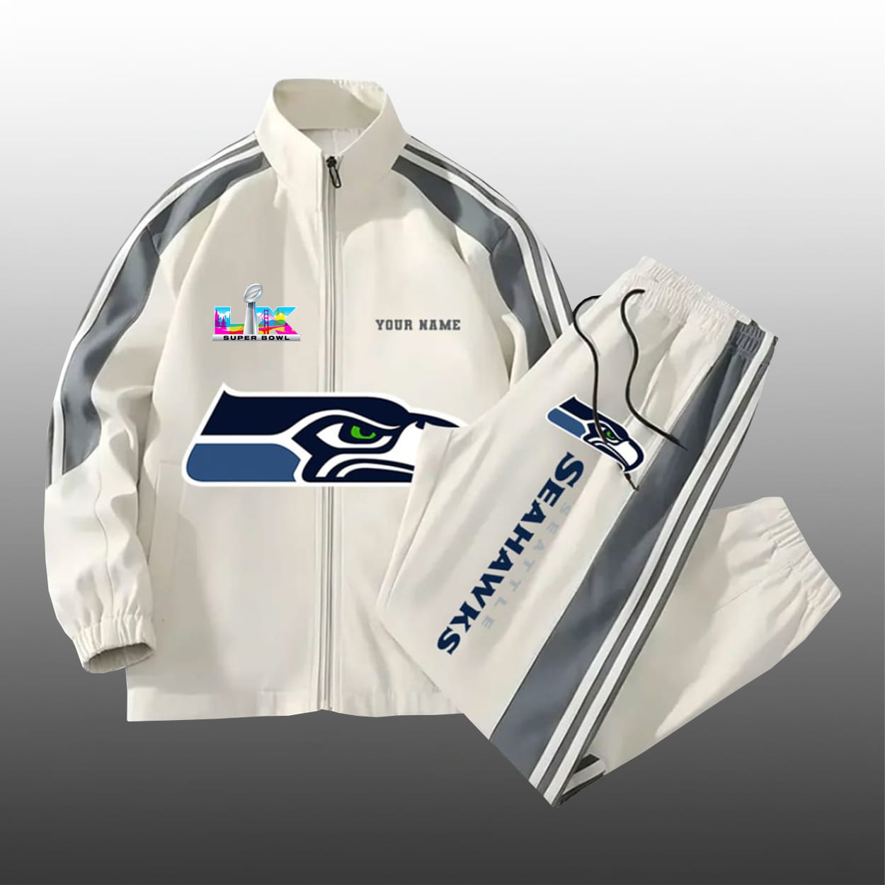 Get ready to turn heads and rep your team like never before with this set. This dynamic duo includes a zip-up jacket and matching pants, both decked out in championship swagger. The jacket features the iconic Seahawks logo front and center, flanked by sleek gray and black stripes that scream movement and energy. A playful “LX” badge pops with color on the chest, adding a splash of personality. And the best part? The “YOUR NAME” text lets you personalize the look—because this victory belongs to you, too. The pants carry the momentum with a vertical “SEAHAWKS” print and logo near the pocket, tying the whole set together in a bold, unified statement.