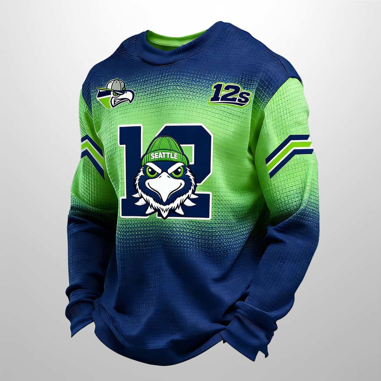 This sweatshirt is a vibrant shout-out to the fans who make Seattle football legendary. The gradient design flows from electric green at the top to deep blue at the bottom, echoing the team’s iconic colors. Front and center, the oversized number “12” takes the spotlight, with the Seahawks mascot’s face peeking through, rocking a green beanie stamped with “SEATTLE.” On the left chest, a helmet graphic proudly carries the Seahawks logo, while the right side balances it with bold “12s” text. Two green stripes on each sleeve add a sporty edge, making this piece as dynamic as the fans it represents.