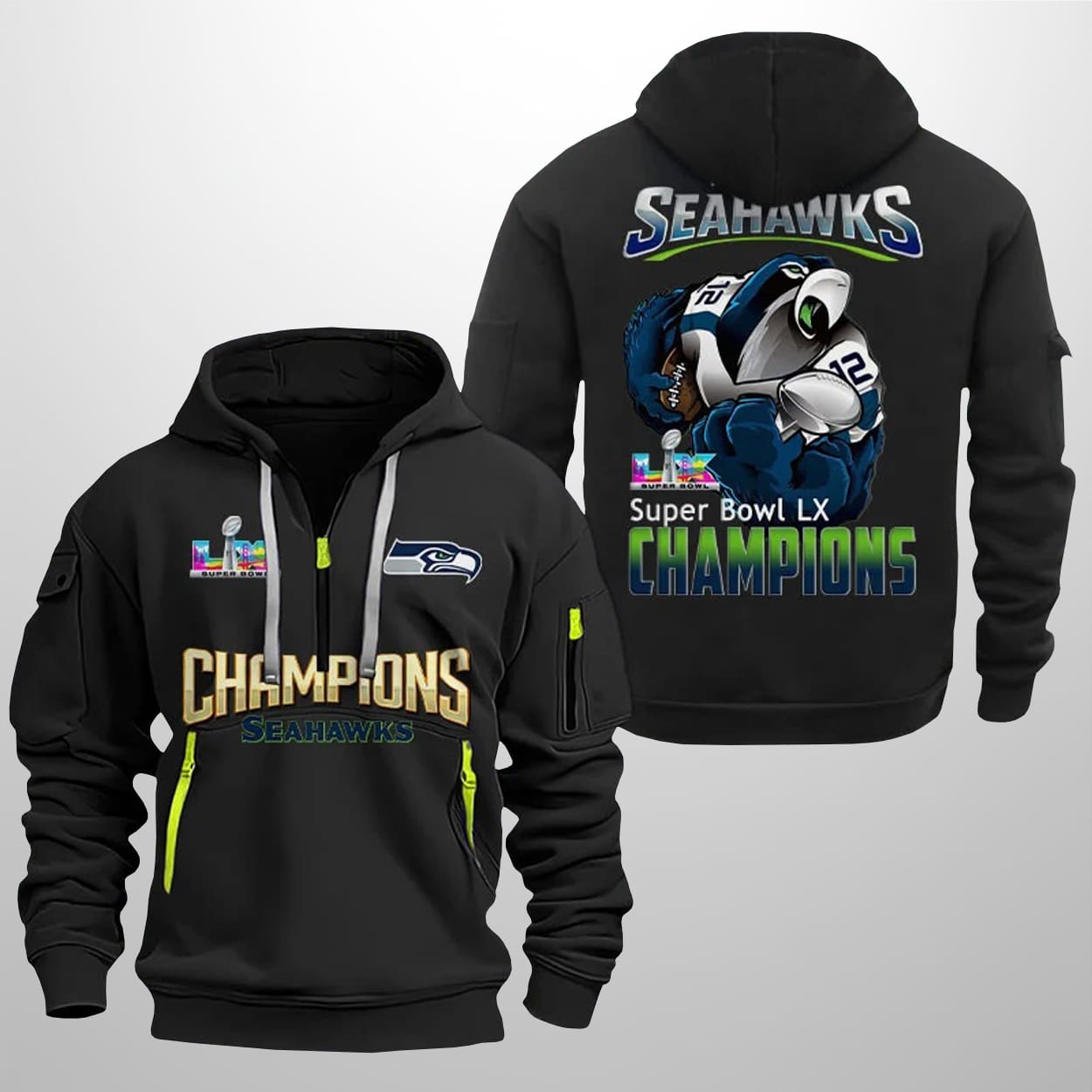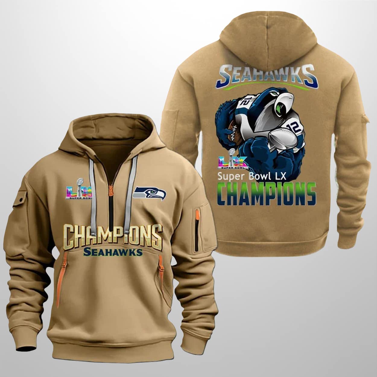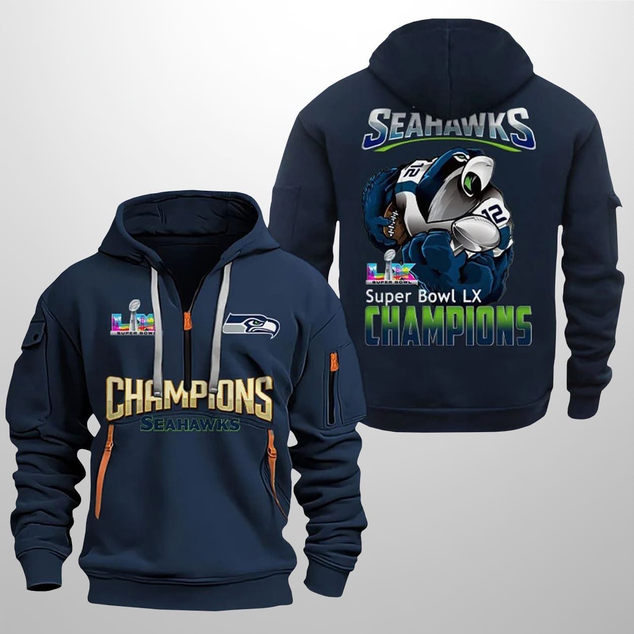 This hoodie is a wearable celebration of victory. On the front, “CHAMPIONS” shines in striking gold, with “SEAHAWKS” proudly displayed beneath. The Seahawks logo sits on the left chest, balanced by the SB LX emblem on the right, while orange zipper accents and a sleeve pocket add a modern edge. Turn it around, and the back bursts with energy: “SEAHAWKS” in bold silver lettering crowns a dynamic illustration of a player in the iconic number 12 uniform. Below, “SB LX CHAMPIONS” glows in a colorful gradient, making the hoodie a statement from every angle.