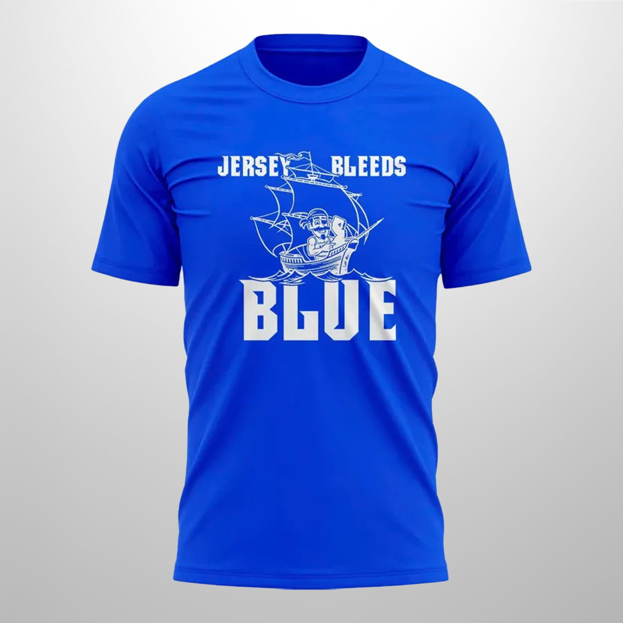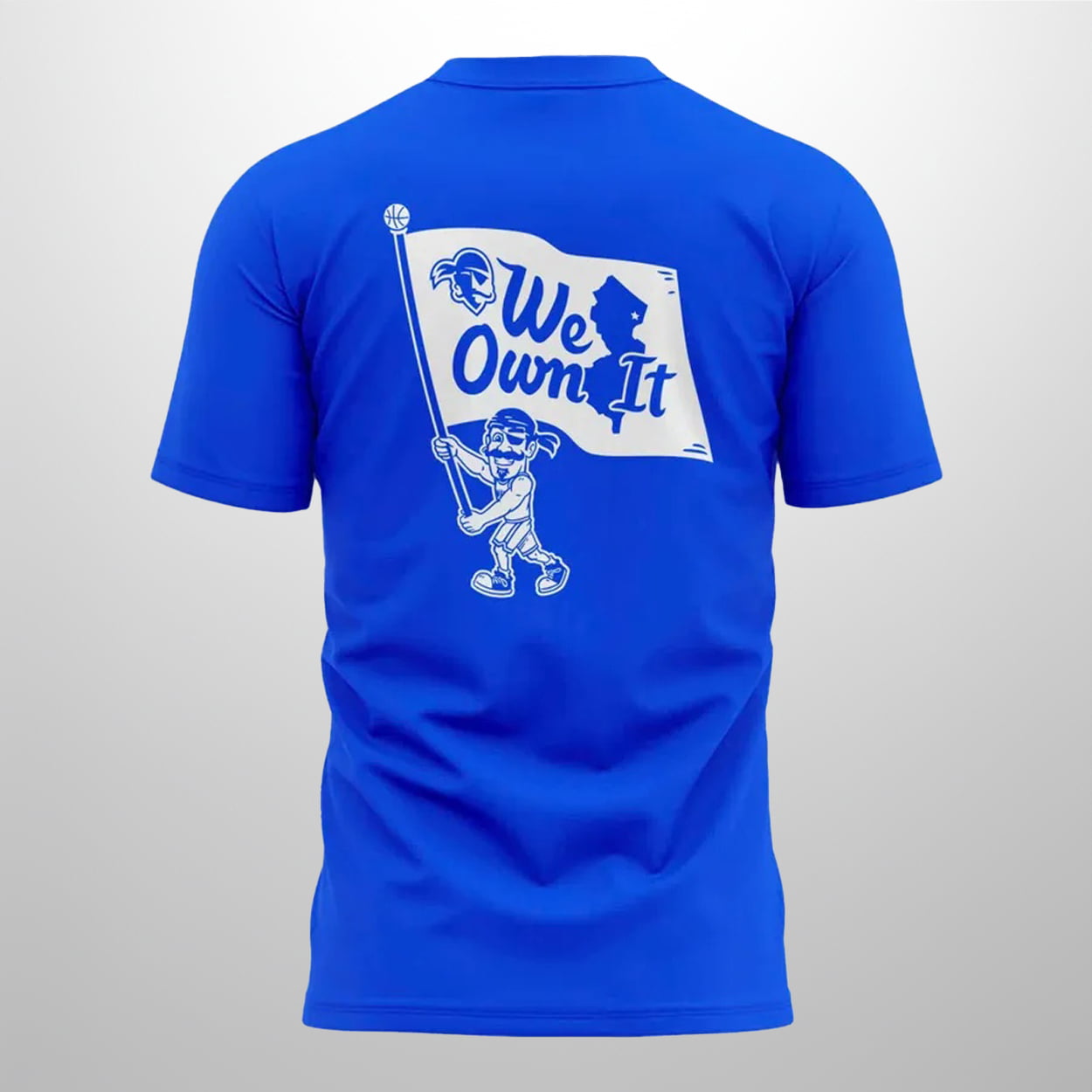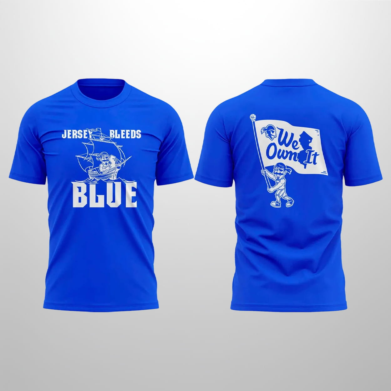 This shirt is a rally cry wrapped in bold blue. On the front, the phrase “JERSEY BLEEDS BLUE” takes center stage, backed by a fierce pirate wielding a sword in front of a ship with full sails—ready to conquer. Flip it around and the energy doubles: the same pirate now hoists a flag that reads “We Own It,” stamped with a stylized pirate head logo. This isn’t just a shirt—it’s a declaration of dominance, loyalty, and unshakable pride for Seton Hall basketball.