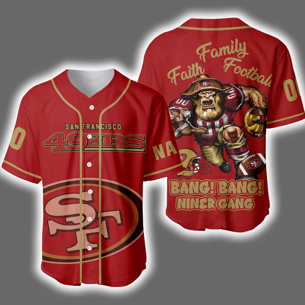 This isn’t just a jersey—it’s a declaration. Drenched in iconic red with gold and white accents, the front proudly displays “49ERS” alongside the team’s classic logo. The number “00” pops on both sleeves, adding a sporty edge. But the real showstopper is on the back: a roaring lion decked out in full 49ers gear, clutching a football like it’s game day every day. Above the beast, the words “Faith Family Football” remind you what matters most. Below, “BANG! BANG! NINER GANG” shouts your allegiance loud and proud.