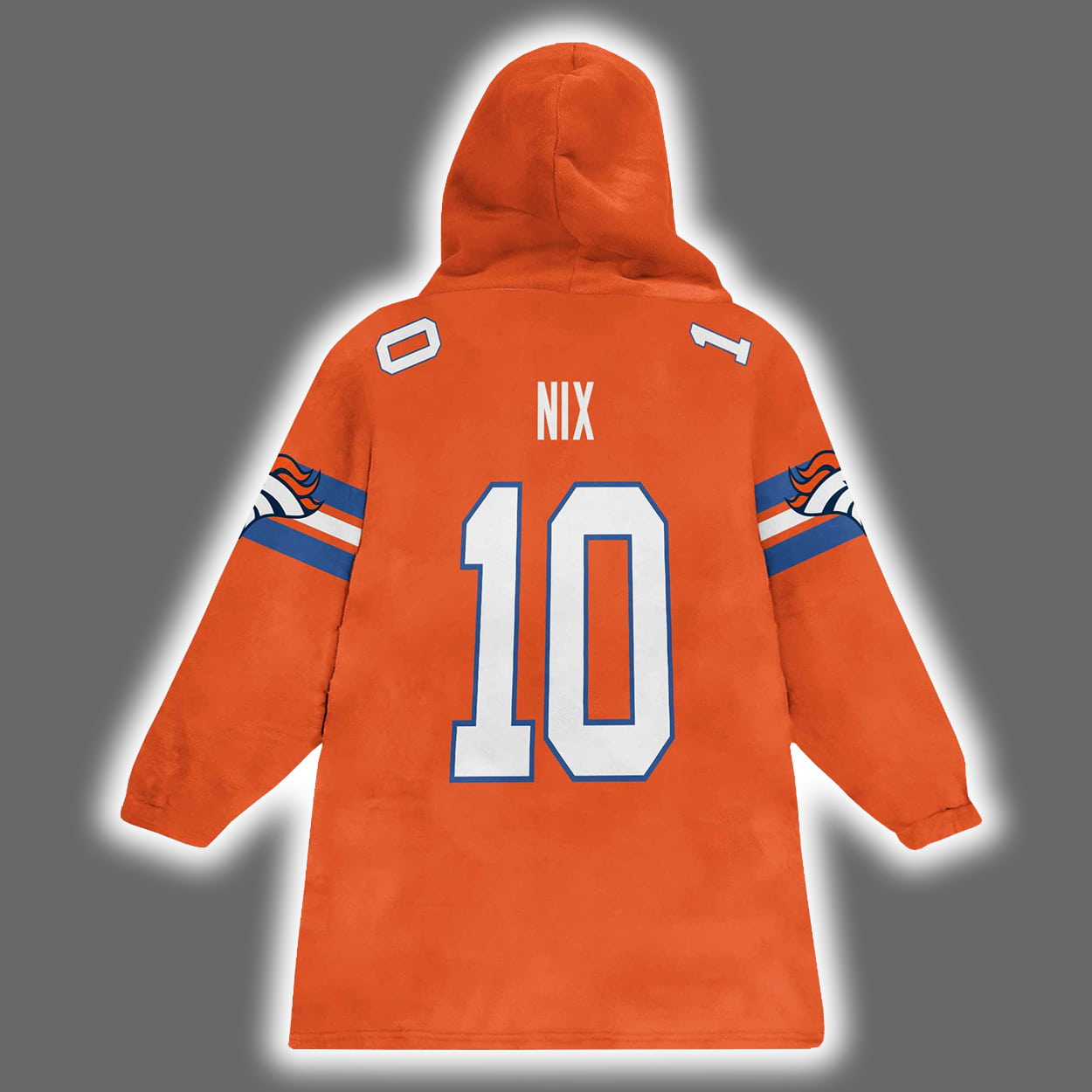 Get ready to warm up with Denver pride in this hoodie. This vibrant orange hoodie is a touchdown in comfort and charm, featuring bold blue and white accents that echo the Denver’s iconic colors. The front proudly declares “SHE LOVES THE” in crisp white lettering, followed by a giant blue “D” with a rearing white horse inside—a playful nod to the team’s legendary defense. On the back, “NIX” sits above the number “10,” giving it the look of a personalized jersey. With sleeve stripes and shoulder numbers to match, this hoodie is perfect for young fans who want to show off their team love in oversized style.