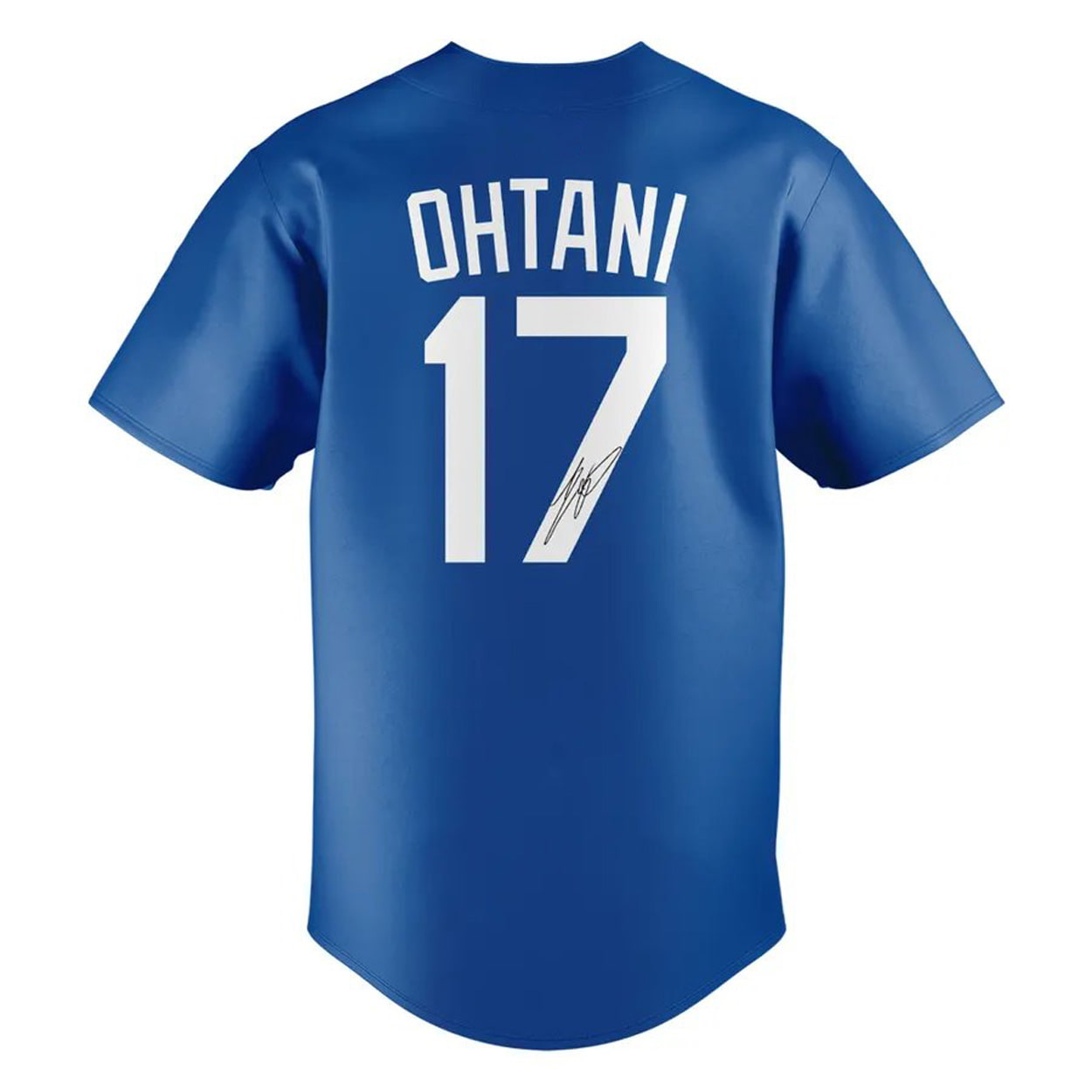Step into greatness with this jersey. This electric blue piece captures the thrill of victory and the swagger of a superstar. On the front, a dynamic graphic of Ohtani mid-swing commands attention, framed by the bold text “MVP” in stylized team lettering. The design pops with energy, making it clear this isn’t just any jersey—it’s a celebration of dominance. Flip it around and you’ll find “OHTANI” in crisp white block letters above the number 17, a nod to the player who redefined what it means to be valuable.