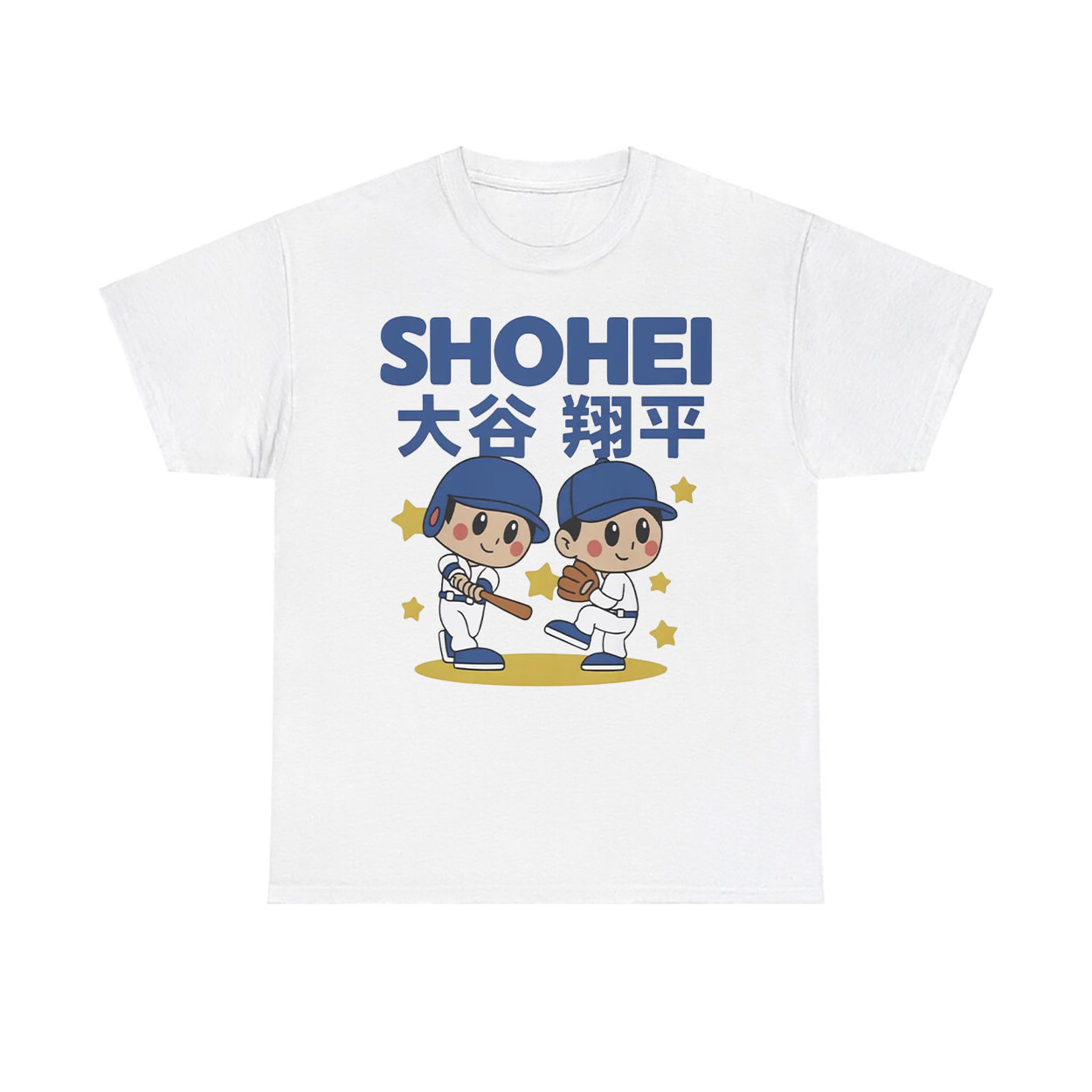 Step up to the plate with this shirt—a must-have for fans who love flair as much as fastballs. This white tee bursts with color and character, featuring two animated baseball figures decked out in uniforms and helmets. One wields a bat with swagger, while the other readies a glove and baseball, capturing the dual-threat magic of Ohtani himself. Above the scene, bold text reads “SHOHEI” alongside his name in Japanese: “大谷 翔平,” adding an authentic touch for fans of the global icon. Yellow stars dance around the characters, giving the design a pop-art energy that’s impossible to ignore.