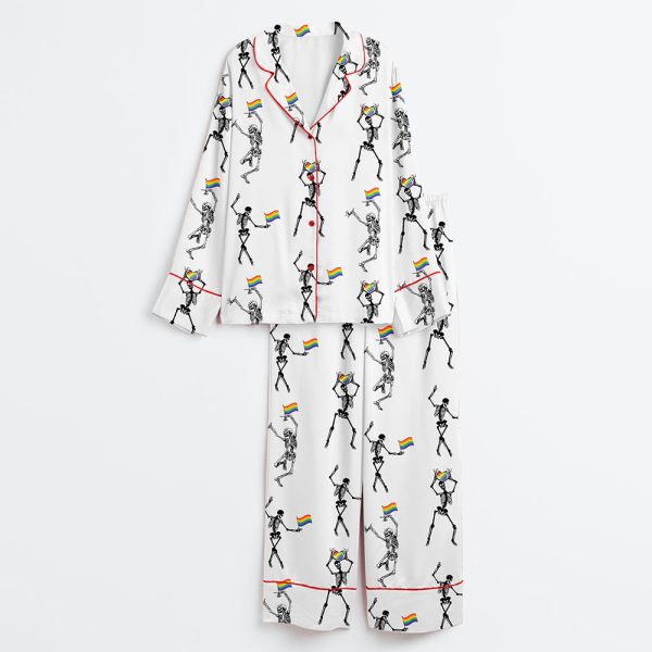Discover the Skeleton Pride Rainbow LGBTQ Funny Gay Pride Print Satin Pajama Set – a playful, bold sleepwear set featuring dancing skeletons with rainbow flags, crafted from luxurious satin for ultimate comfort and style.