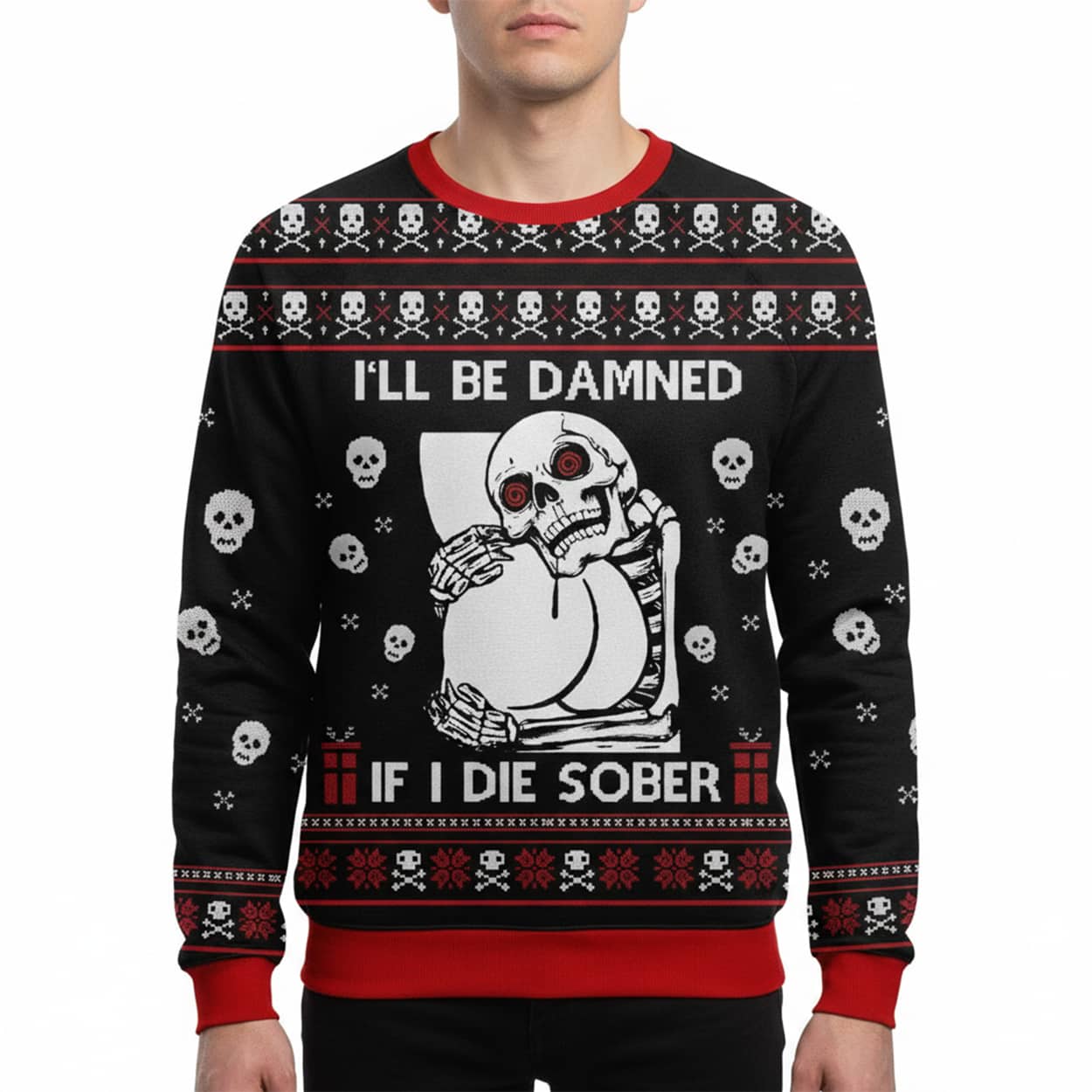 Raise spirits and eyebrows with the Skull I’ll Be Damned If I Die Sober Ugly Christmas Sweater—perfect for party legends with a dark sense of humor.