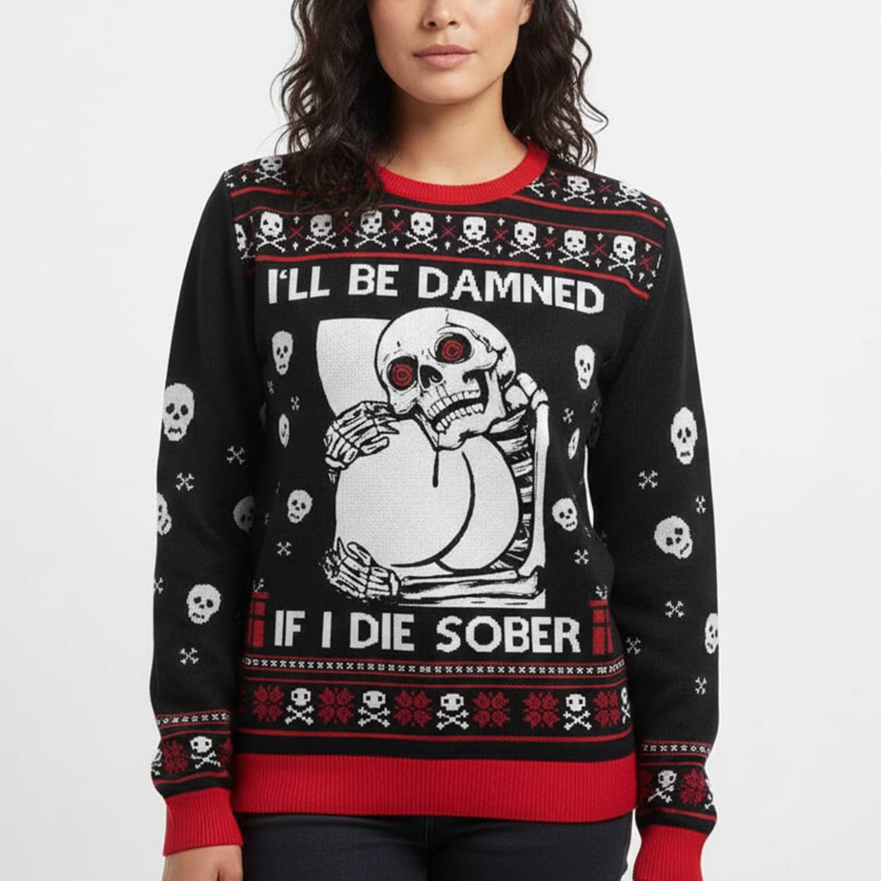 Make a bold entrance this holiday season with this sweater. This edgy design features a skeleton wrapped around a giant white sphere, surrounded by skulls, crossbones, and festive patterns in black and red. The unapologetic message across the chest—“I’LL BE DAMNED IF I DIE SOBER”—delivers a piece of rebellious cheer, making it clear you’re here to celebrate with no regrets.