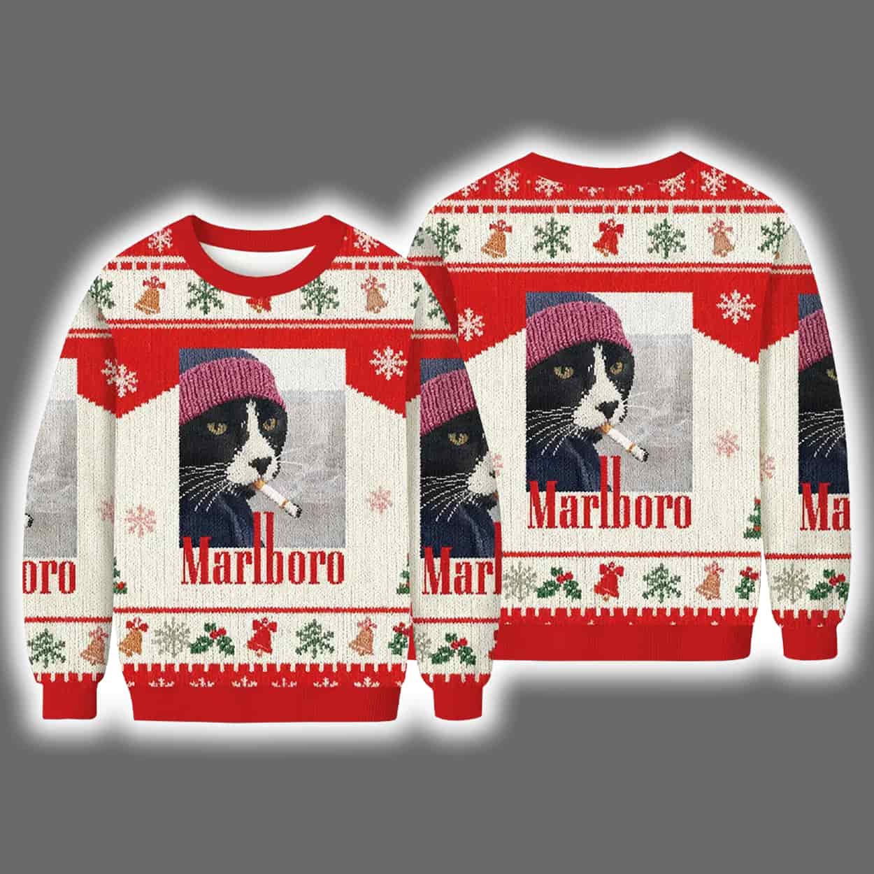 This sweater is a holiday mood wrapped in feline attitude. Front and center is a black-and-white cat rocking a red knit hat, casually puffing on a cigarette like it’s seen one too many Christmases. The snowy backdrop adds a touch of seasonal charm, while the bold “Marlboro”-style text below the image delivers a parody punch that’s impossible to ignore. Surrounding the scene are classic holiday icons — snowflakes, reindeer, gift boxes, and Christmas trees — all rendered in vibrant reds, greens, and whites. It’s festive, it’s funny, and it’s unapologetically cool.
