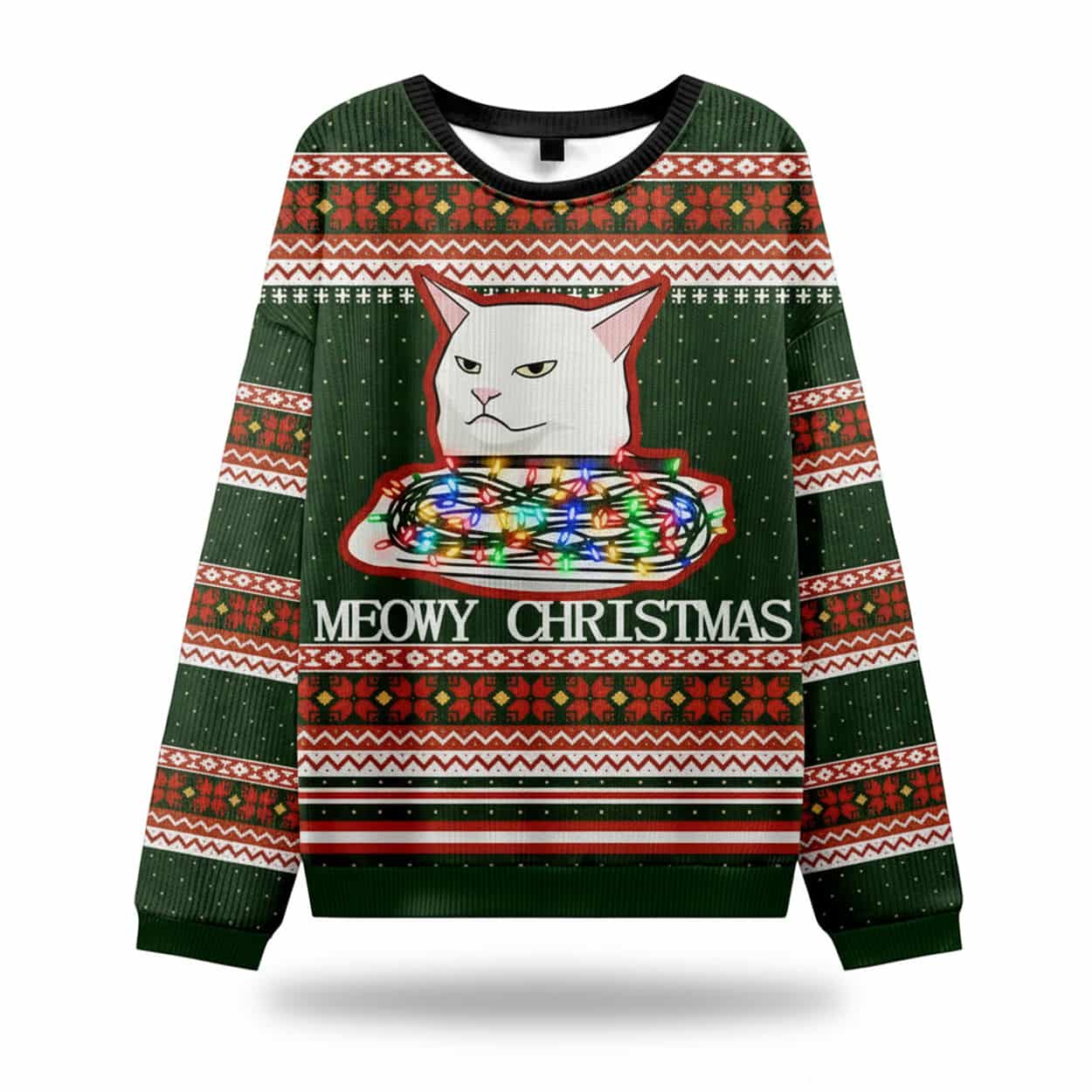 Turn heads and spark laughter at every holiday gathering with this sweater. This dark green sweater is decked out in classic red, white, and green patterns, but the real showstopper is the iconic white cat—Smudge—perched grumpily on a colorful knitted blanket. His unimpressed expression is hilariously relatable, especially during chaotic family dinners. Beneath the feline graphic, bold white letters spell out “MEOWY CHRISTMAS,” adding a cheeky twist to traditional holiday greetings.