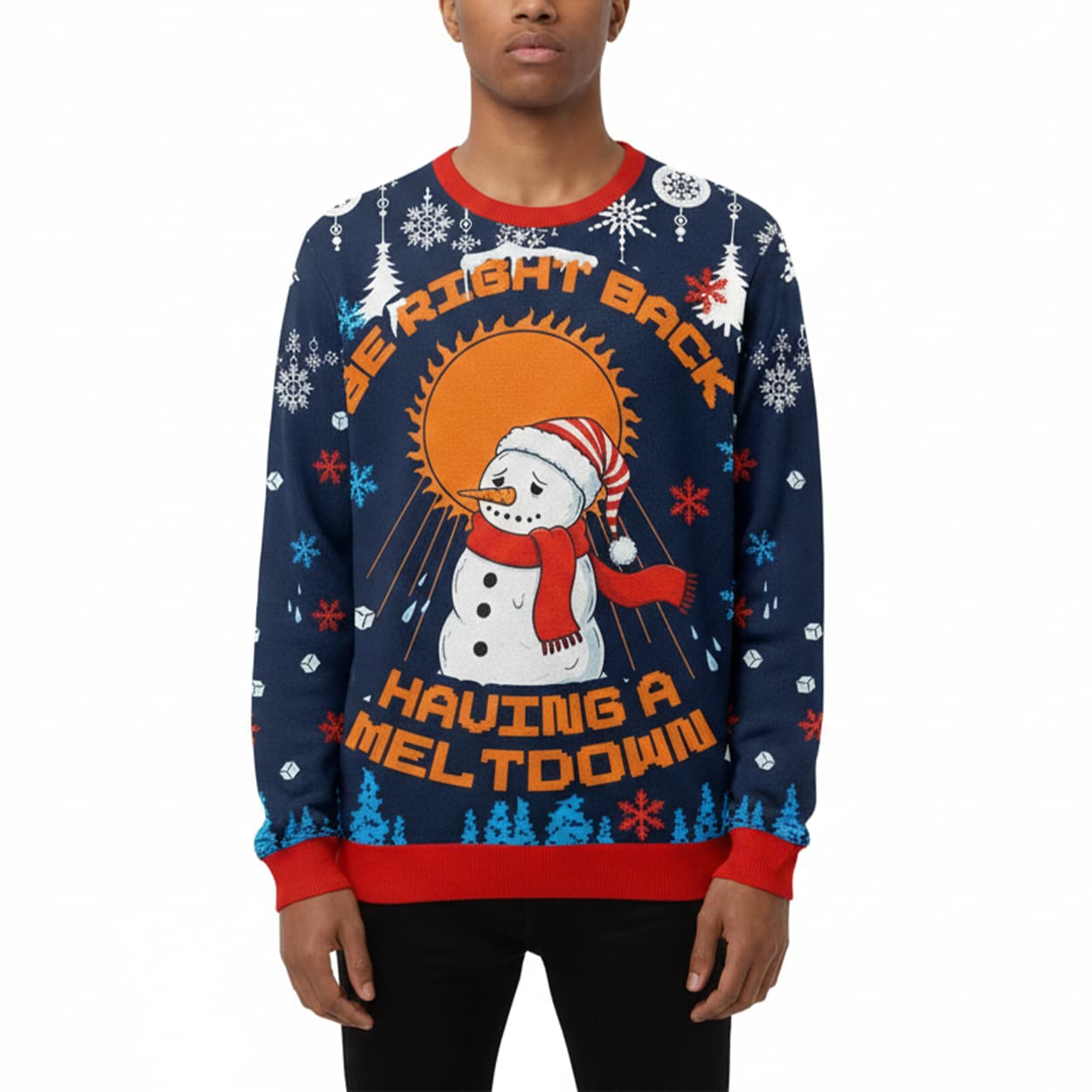 Make a frosty statement with this sweater—a hilarious take on seasonal stress and sunny surprises. The centerpiece features a snowman decked out in a red-and-white striped hat and scarf, visibly melting under a blazing orange sun with dramatic rays. Surrounded by festive icons like snowflakes and Christmas trees, this navy blue sweater pops with red accents and playful patterns. The bold text above and below the snowman reads: “BE RIGHT BACK HAVING A MELTDOWN,” perfectly capturing the mood of anyone juggling holiday madness with a smile.