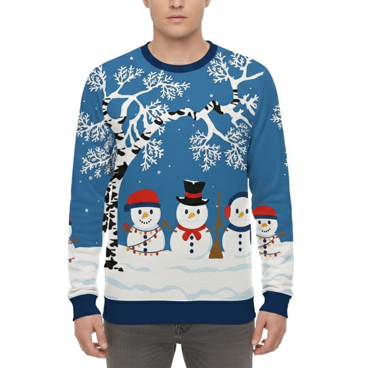 Step into a winter wonderland with this sweater, a festive favorite that brings the magic of the season to life. Set against a cozy blue backdrop sprinkled with snowflakes, this sweater showcases a trio of cheerful snowmen standing proudly in front of a snow-covered tree. Each snowman has its own personality: one wrapped in twinkling Christmas lights with a red hat and scarf, another sporting a classic top hat and broom, and the third rocking a cool blue ensemble. It’s a snowy scene that radiates warmth and holiday spirit.