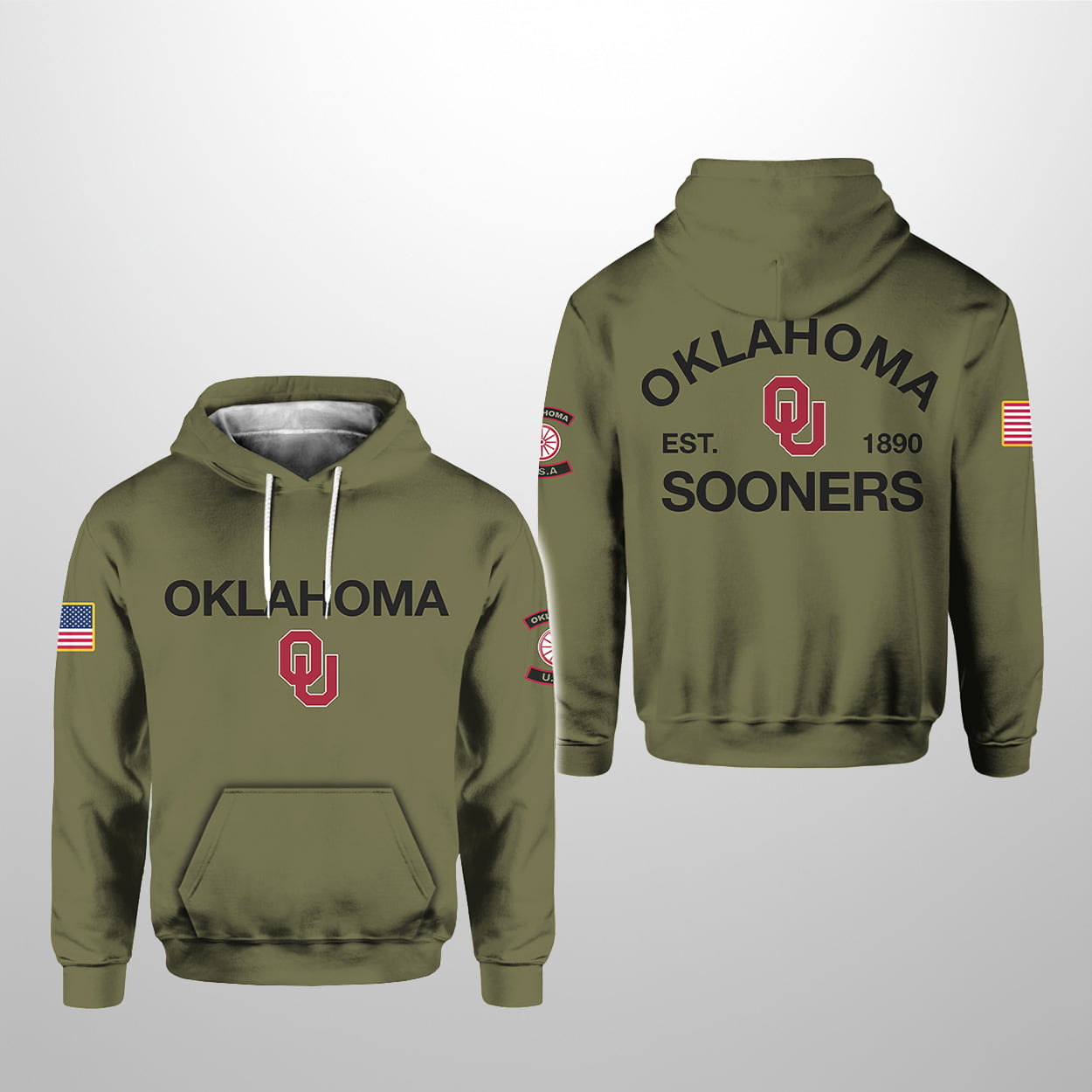 This hodie is a powerhouse of pride, grit, and game-day energy. Wrapped in military green, it features “OKLAHOMA” in bold black across the chest, standing tall above the iconic red “OU” logo. Flip it around and you’ll find “OKLAHOMA” again at the top, followed by the proud “OU” emblem, “EST. 1890,” and “SOONERS” stamped below—because legacy deserves a spotlight. The sleeves bring the attitude: an American flag on the right and a lineup of patriotic and team on the left, making this hoodie a full-on salute to service and school spirit.