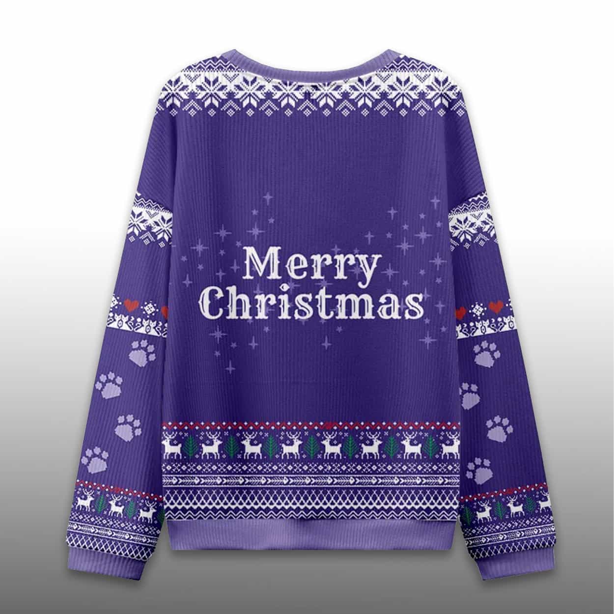 Embrace introversion with the Sorry I’m An Indoor Cat Ugly Christmas Sweater. This hilarious blue knit features a black cat sitting comfortably amidst holiday decorations, surrounded by the text: “SORRY I’M AN INDOOR CAT”. The perfect, witty attire for those who prefer cozy nights in over crowded holiday parties. The back has a simple festive pattern.