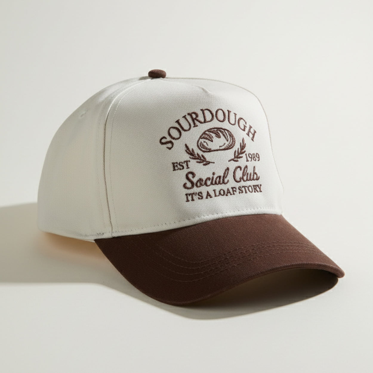 This cap is more than just headwear—it’s a conversation starter. With a crisp white crown and a warm brown brim, the front embroidery features a golden loaf of sourdough flanked by two wheat stalks, crowned by the bold word “SOURDOUGH.” Beneath the graphic, the phrases “EST 1989,” “Social Club,” and the punny “IT’S A LOAF STORY” complete the design. Whether you’re a seasoned baker or just a fan of clever fashion, this hat brings a playful twist to everyday style.