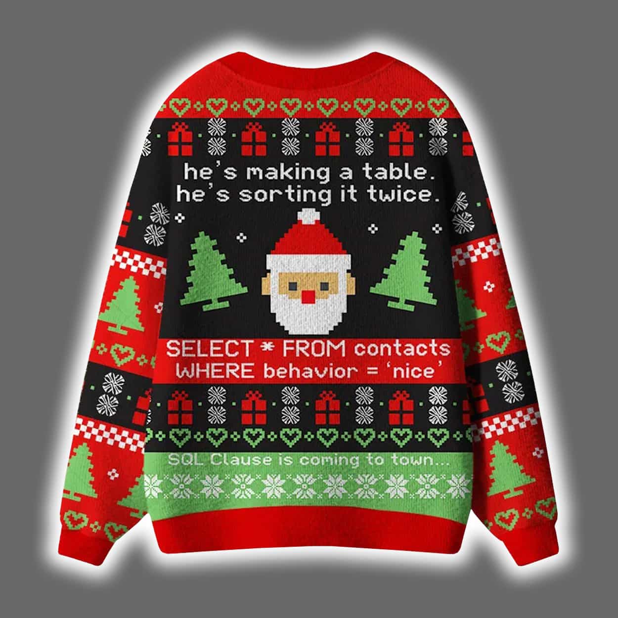 Get ready to sleigh the season with this cardigan—a merry mashup of holiday spirit and programming wit. This eye-catching cardigan features a classic red, green, black, and white palette, decked out with Santa faces, snowflakes, hearts, Christmas trees, and gift boxes. But the real showstopper? The hilarious SQL query printed on both front and back: “he’s making a table. he’s sorting it twice. SELECT * FROM contacts WHERE behavior = ‘nice’;” It’s a clever nod to Santa’s legendary list, reimagined for the data-driven crowd.